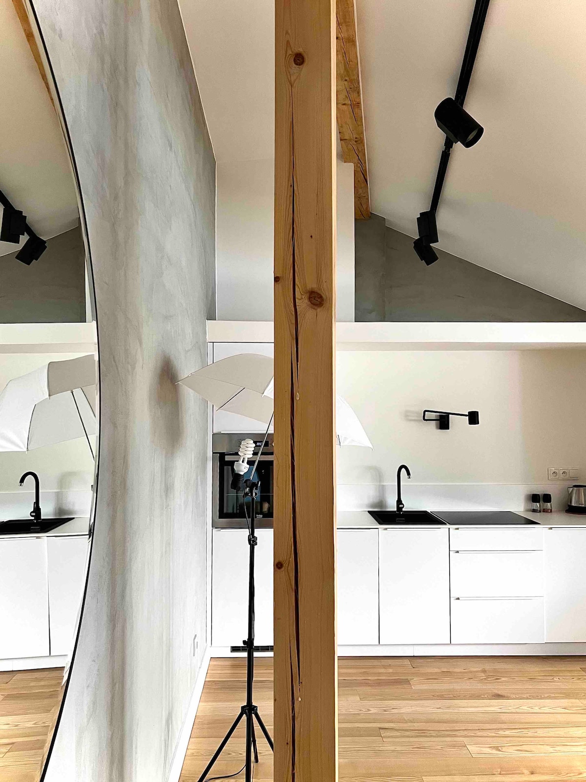 Öll eignin er með aðskildum aðskildum aðalinngangi, salerni og baðherbergi. Það er nóg pláss til að skemmta sér fyrir alla fjölskylduna. Ég býð þér rúmgóða, rúmgóða og stílhreina háaloftssvítu sem skiptist í stofu, svefnaðstöðu, borðstofu, barnahorn, einbreitt rúm fyrir börn, fataherbergi, tvo vinnustaði með internetaðgangi og prentara. Fjögurra manna fjölskylda býr á neðri hæðinni (eiginmenn, tvö börn og tveir hundar.