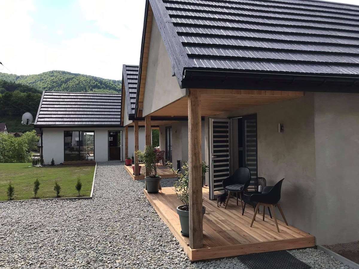 Nútímalegt hús (150m²) fyrir fjóra með heitum potti, sánu, kvikmyndahúsi og rúmgóðum garði. Í kringum skóginn, fullkomið til gönguferða. Innréttingin felur í sér eldhús, stofu, svefnherbergi, 2 baðherbergi og bílskúr. Þar er grill, borðspil, foosball, pílukast og leikvöllur. Veröndin er með útsýni yfir fjöllin. Margir áhugaverðir staðir eru á svæðinu: stöðuvatn, fjallaslóðar, almenningsgarðar og frábærir veitingastaðir. Fullkominn staður til að slaka á í ró og næði.