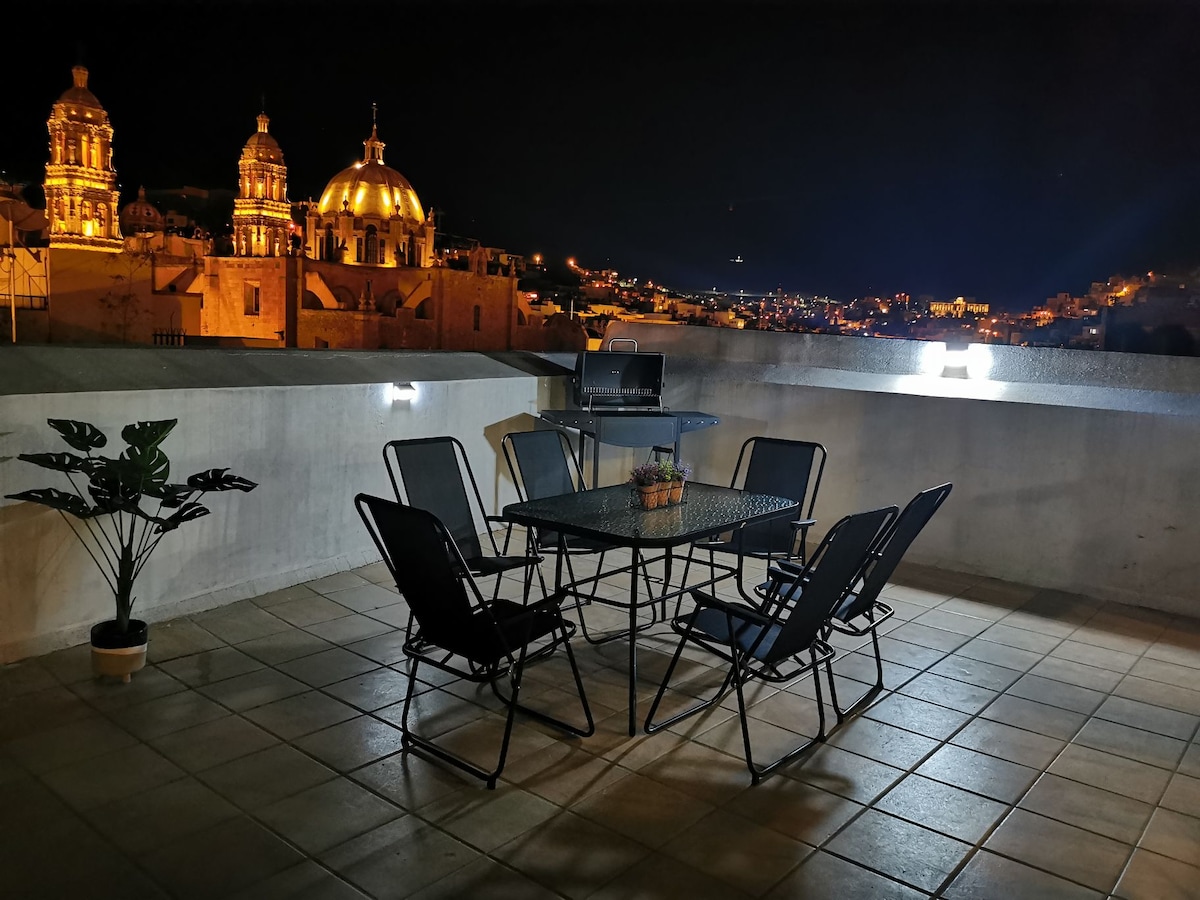 (115m²) Rúmgóð fjölskylduíbúð á frábærum stað! ein og hálf húsaröð að Alameda Central García de la Cadena "Callejoneadas", 3 húsaraðir að Edén Mine+Cable car ride+La Bufa Hill, Fátima Church and Goitia Museum, 4 húsaraðir að Hotel Quinta Real! Í fegurð og öryggi sögulega miðborgarinnar skaltu njóta óviðjafnanlegs útsýnis með öllum þægindum: Þráðlaust net, snjallsjónvarp 50 ", kapall, Netflix, búið eldhús, sjálfvirkt heitt vatn allan sólarhringinn, rafmagnsviftur. Bílastæði með einum bíl. Verið velkomin!