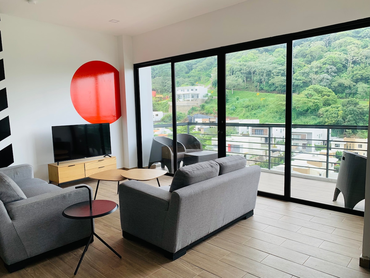 Sökktu þér niður í nútímalegan lúxus í þessari rúmgóðu íbúð á 7. hæð í Nuevo Cuscatlán, einu eftirsóknarverðasta hverfi San Salvador. Þetta er tilvalinn staður til að slaka á eftir að skoða sig um í stílhreinni iðnhönnun, gluggatjöldum sem ná frá gólfi til lofts og hressandi fjallagolu. Aðeins 35 mínútur frá El Tunco í Brimborg og nálægt flottum veitingastöðum, verslunum og sendiráðsskrifstofum.