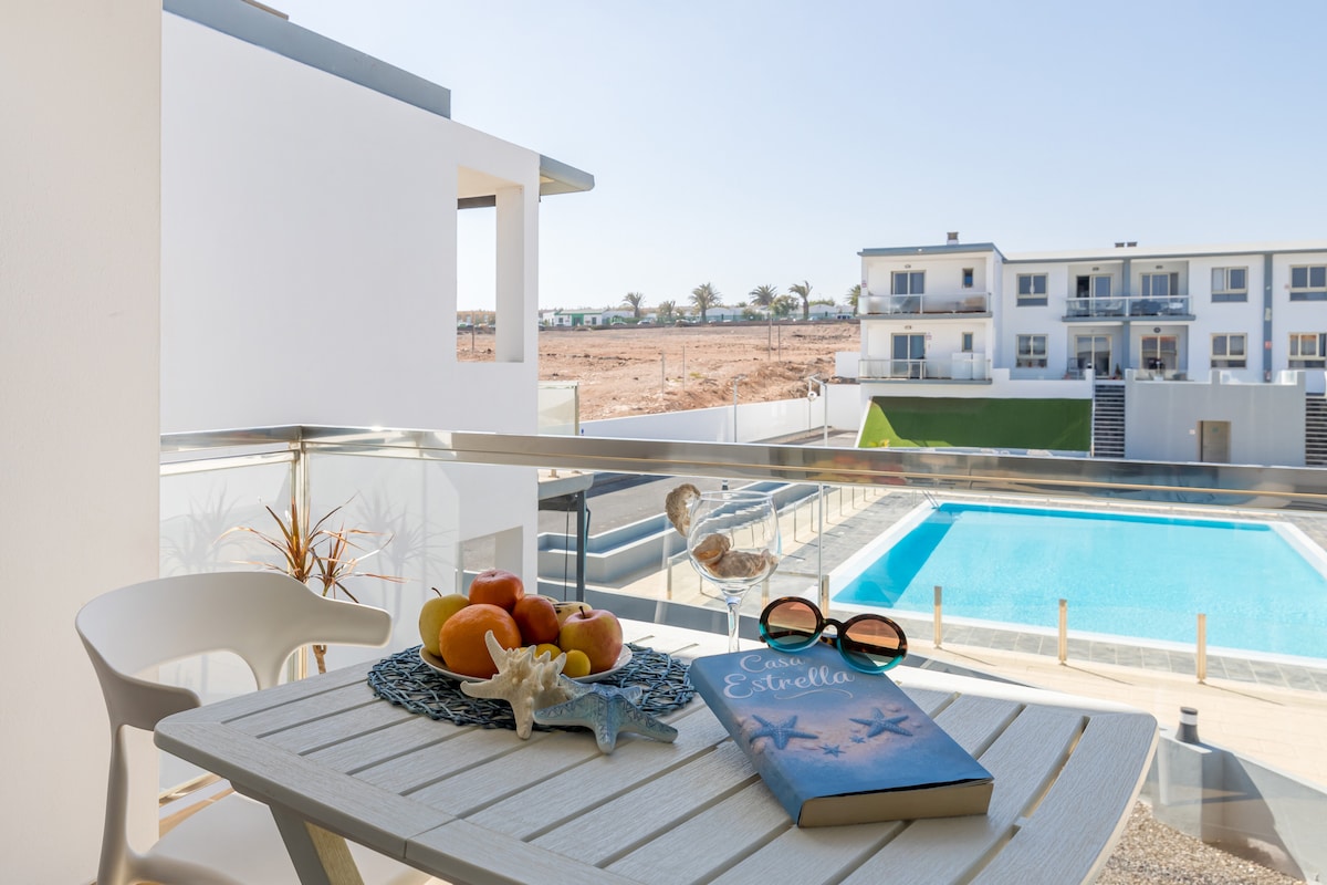immerse yourself in tranquility and elegance at Casa Estrella, a serene oasis featuring a tastefully renovated one-bedroom, one-bathroom apartment with a living room, kitchenette, and sofa bed. Located in a newly built complex, it's just 50 meters from bars, restaurants, and a small market. The main beach of Caleta de Fuste is an 8-minute drive or a 15-minute walk away. A bus stop is nearby, but a car is recommended for convenience.Immerse yourself in tranquility and elegance at Casa Estrella