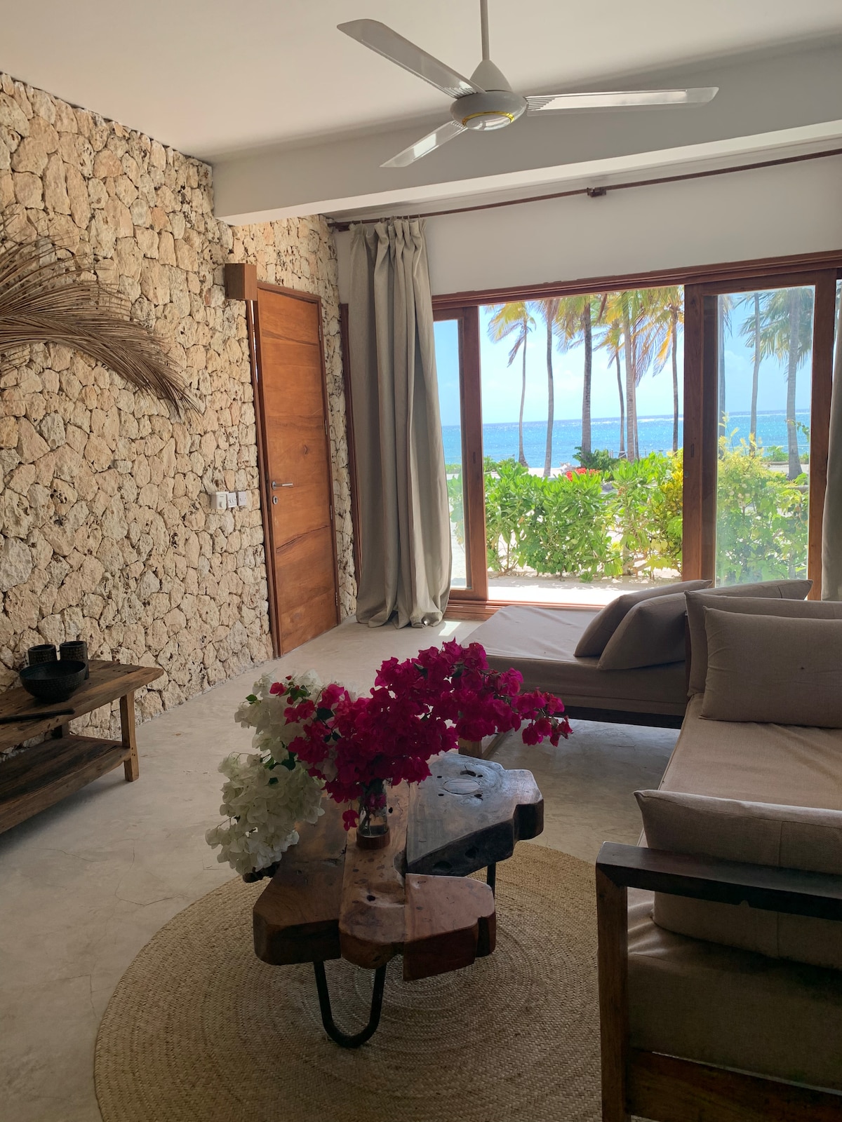Sambýlið okkar er staðsett við ströndina með 4 svefnherbergja villu að framan og aðskildri villu með 1 svefnherbergi að aftan sem er leigð út sér . Útsýnið er í heimsklassa, póstkortið er fullkomið með útsýni yfir Indlandshaf og kóralrifið í kringum Mnemba eyjuna. Ströndin er mjög örugg dag og nótt . Það eru nokkur hönnunarhótel með börum og veitingastöðum í göngufæri frá villunni. Villan er heimilisleg og eignin er tilvalin fyrir pör eða fjölskyldur.