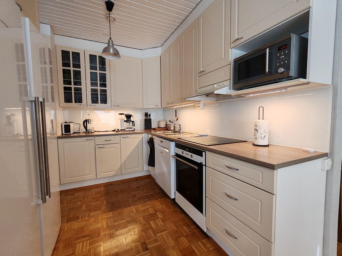 Njóttu lífsins á þessum næstum nýja, friðsæla og miðlæga stað. Eignin er staðsett nálægt lestarstöðinni við jaðar miðlæga markaðarins. Skoðaðu beint inn á markaðinn. 65" sjónvarp, þvottavél, uppþvottavél, vinnurými og gufubað. Möguleg bílastæði í bílastæðahúsi borgarinnar. Öll þjónusta í miðbænum í göngufæri. Í svefnherberginu eru tvær aðskildar dýnur. Sófi sem hægt er að dreifa úr í vinnurými. Kæliloftsprettu varmadæla.