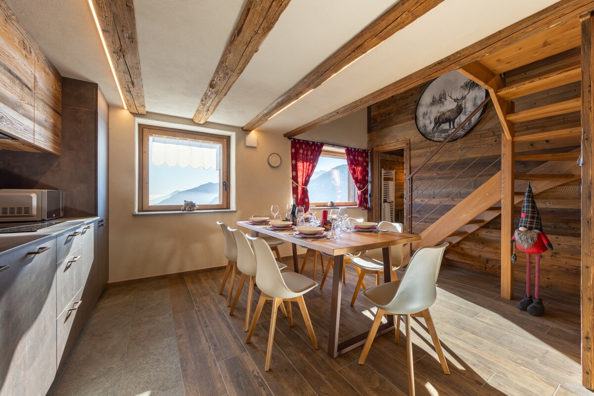 Alps Mountains. Italy. Aosta Valley. A cabin in a small village at 1600 meters,in the peace of meadows, grazing cows and mountains. Snow (usually) in the winter. A place of the heart, lovingly restored preserving the ancient beams of the roof. A wonderful view from the large windows and a special tranquility for those in search of peace, warmth and relaxation. The furniture is very nice: wood above all, but also more lively colors, and modern comforts. Quiet excursions, both on snowshoes or ski.