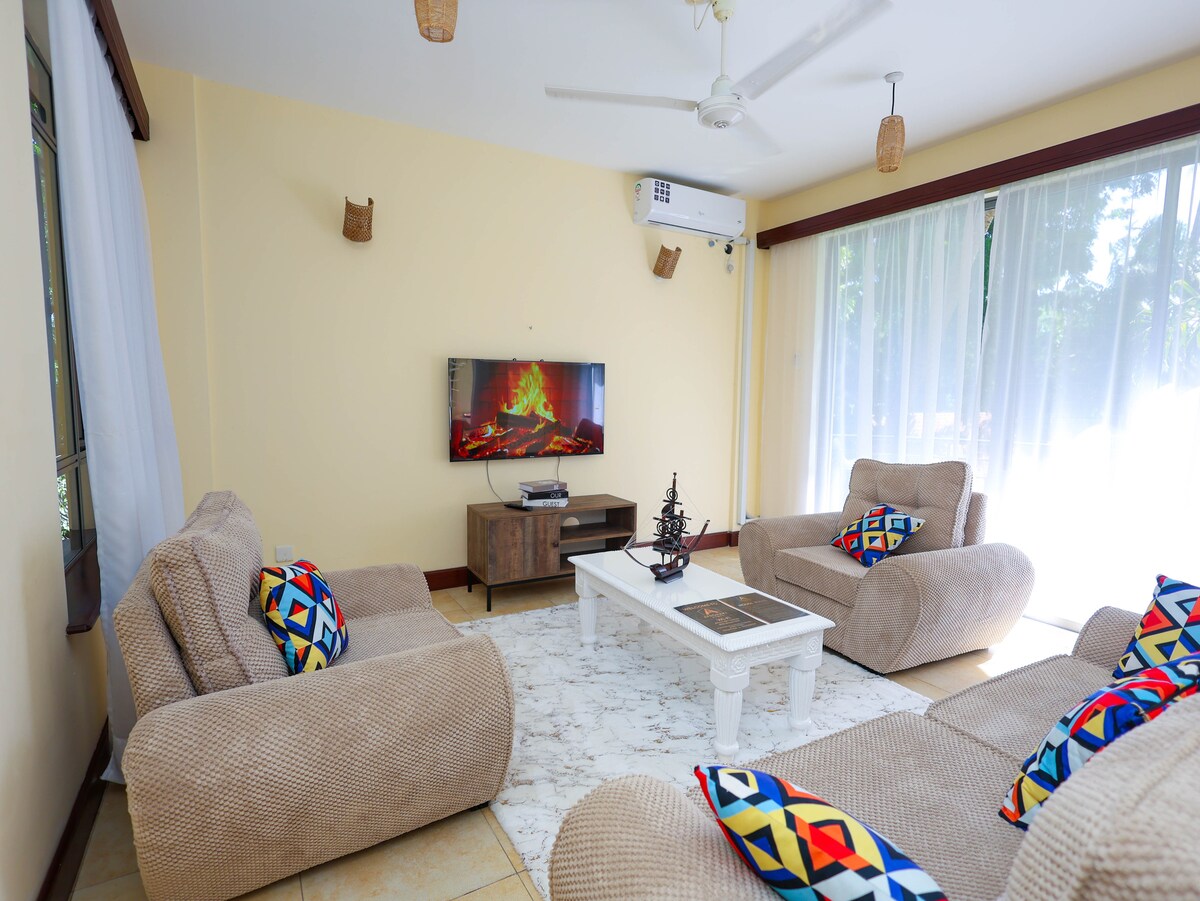 Verið velkomin í strandfríið ykkar í Aqua Gardens, Nyali. Þessi glæsilegi tveggja svefnherbergja íbúð sameinar þægindi og hentugleika með rúmgóðum herbergjum, fullbúnu eldhúsi, hröðu þráðlausu neti og notalegri stofu sem er fullkomin til að slaka á eftir ströndina. Njóttu sundlaugarinnar, öruggs bílastæðis og þægilegs aðgengis að vinsælustu stöðunum í Nyali—veitingastaðir, verslunarmiðstöðvar og hafið eru aðeins í nokkurra mínútna fjarlægð. Fullkomin fyrir fjölskyldur, vini eða vinnuferðir, með rólegu og afslappandi yfirbragði sem gerir þér auðveldara fyrir að koma þér fyrir og líða eins og heima hjá þér.