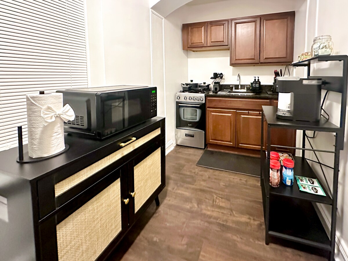 Björt og sólríka Oak Park jumbo garðstúdíó, skref frá sætum miðbæ, lest til Chicago og ótrúlegum ferðamannastöðum - eins og Hemingway Home og Wright Studio. Þetta móttökustúdíó var algjörlega endurbyggt og uppfært. Við leggjum mikla áherslu á að hanna afslappandi íbúð með öllum þægindum. Aðalherbergið er með king-size rúm, skrifstofukrók og fullbúið afþreyingarsvæði með leikjum, bókum og sjónvarpi. Rúmgóða eldhúsið og lúxusbaðherbergið eru glænýtt!