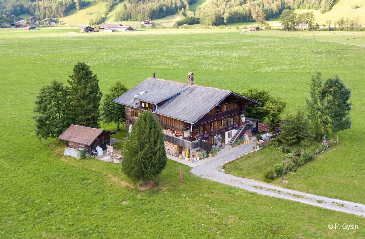 Die Ferienwohnung wurde im 1. Stock des Simmentaler-Holzhauses eingebaut. Sie bietet mit zwei grossen Schlafzimmern, einer Wohnküche, einem Bad und einem kleinen Balkon genügend Platz für fünf Personen.