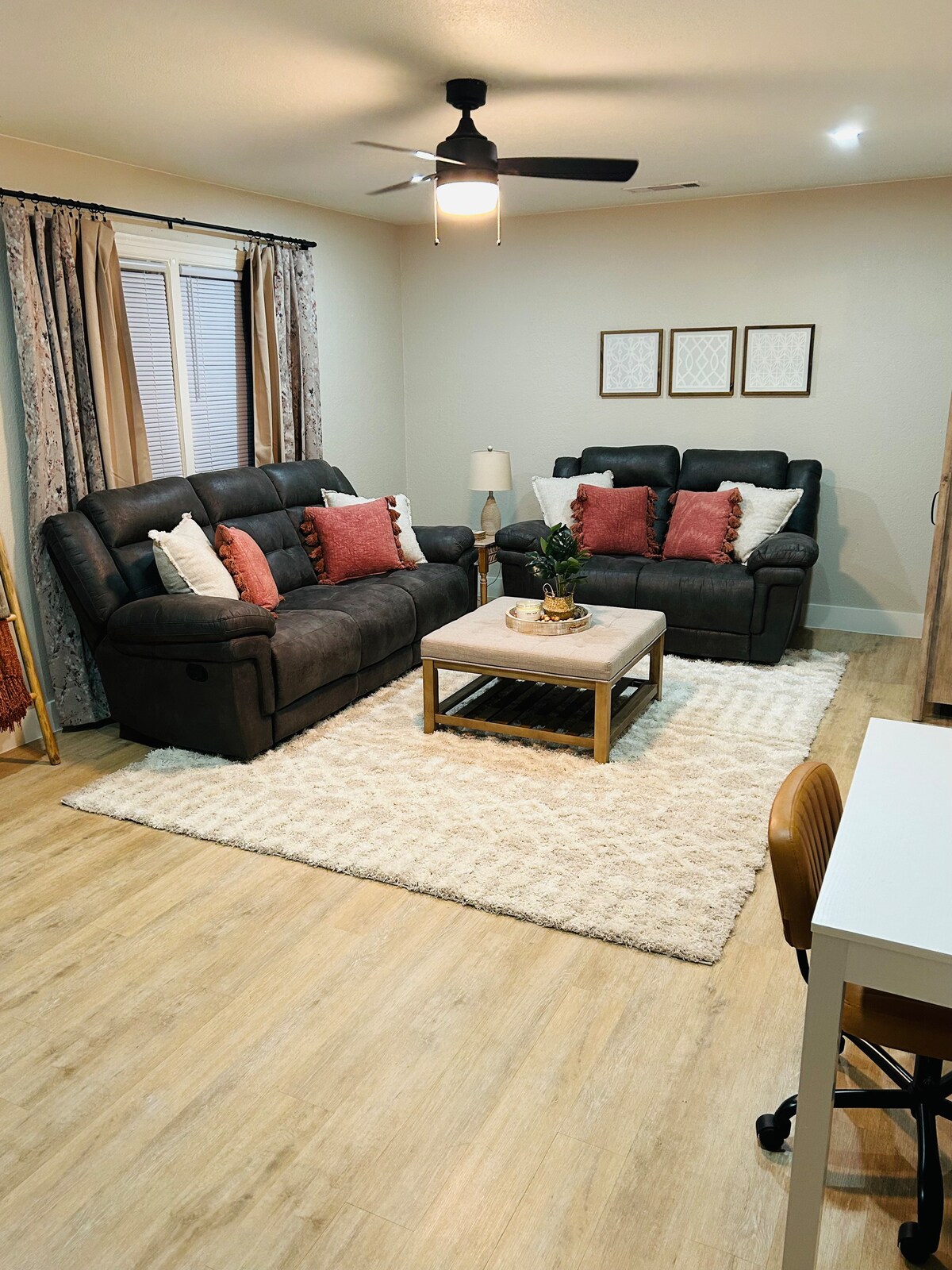 Verið velkomin á heimili þitt að heiman í rólega smábænum okkar. Þessi notalega eins svefnherbergis íbúð er fullkomin fyrir ferðalanga sem eru einir á ferð, pör eða fjarvinnufólk sem sækist eftir þægindum, þægindum og friðsælum stað til að hlaða batteríin. Hér er þægilegt rúm í queen-stærð, fullbúið eldhús og sérstök vinnuaðstaða með skrifborði sem hentar vel til að ljúka málum áður en því er lokið. Hvort sem þú ert hér til að slaka á eða einbeita þér færðu allt sem þú þarft fyrir afkastamikla eða afslappaða dvöl.