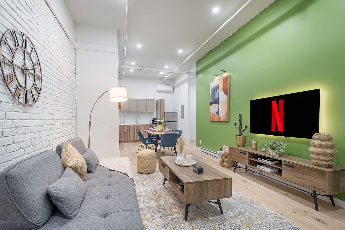 The Savvy is a spacious luxury 1-bedroom apartment in the heart of Vieux-Montréal’s Old Port, steps from restaurants and the riverfront, sleeping up to 4 guests in comfort. Perfect for winter escapes, family trips, business travel, Palais des congrès events, or a refined one-night stay. With soaring ceilings, historic brick, elegant décor, and a quiet courtyard-facing bedroom, it feels like a boutique hotel yet fully private, with premium amenities, fast Wi-Fi, and a 5-star host at your service.