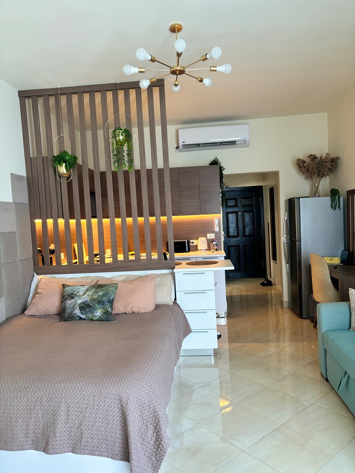 Njóttu stílhreinnar og rómantískrar upplifunar á þessum stað miðsvæðis. Fyrir framan Dream Beach, aðeins 50 metra frá Hurghada ferðamannaþorp Street Nútímaleg húsgögn með mjög hraðvirku þráðlausu neti, Netflix og youtube Þessi íbúð er með sérstakan eldhúsbúnað, örbylgjuofn, þvottavél, espressóvél, ketil og fullt kaffi og te viðbót Einnig straujárn og strauborð og skrifborð fyrir fjarvinnu Rómantískt eitt svefnherbergi fyrir elskendur og eitt svefnsófi
