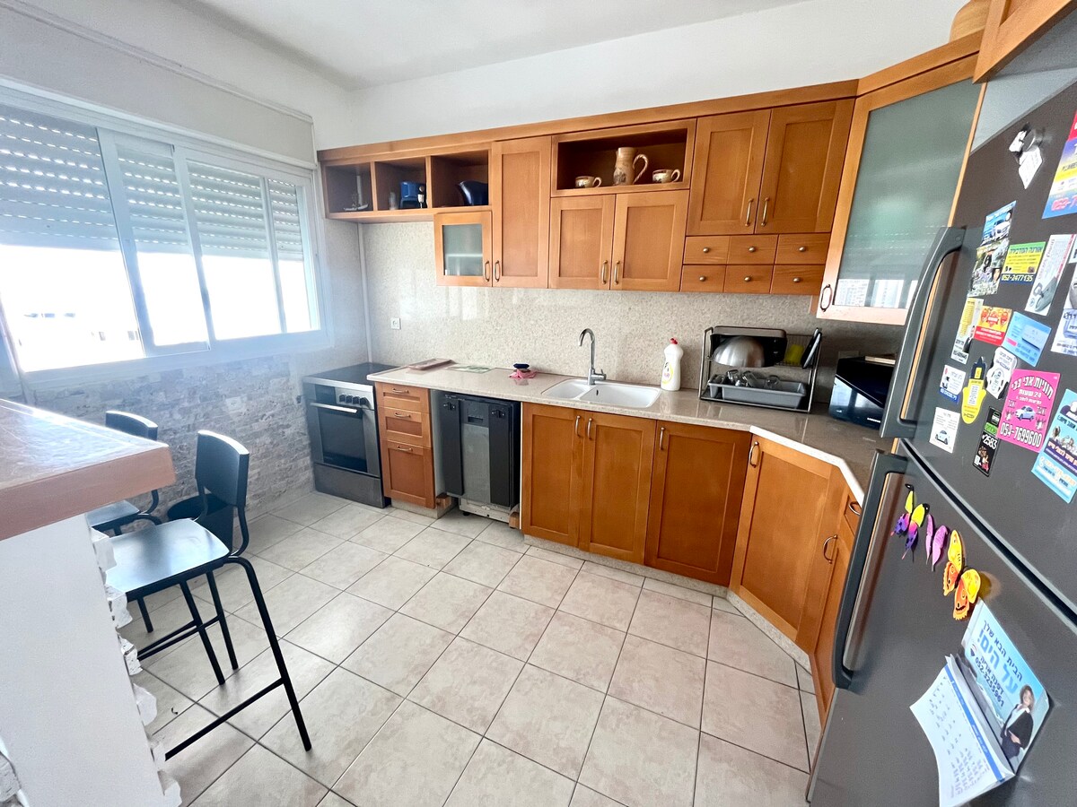 Þægileg þriggja herbergja íbúð í Givat Olga, með 2 svefnherbergjum (öruggt herbergi) á 5. hæð með lyftu. Mjög fallegt útsýni yfir sjóinn. Róleg, björt íbúð, á móti matvöruverslun sem er opin til kl. 22:00 og verslunum. Nálægt stoppistöðvum strætisvagna. Miðborgin er í 5 mínútna göngufæri. Stöðin er í 5 mínútna akstursfjarlægð. 3 mínútna göngufjarlægð frá ströndinni, beinn aðgangur. 3 mínútna göngufjarlægð frá nýju „tayelet“ göngusvæðinu. 5 mínútna göngufjarlægð frá Jacob hótelinu. 15 mínútna göngufjarlægð frá „þorpsversluninni“, stærsta verslunarsamstæðunni. Hjólreiðastígur niðri.