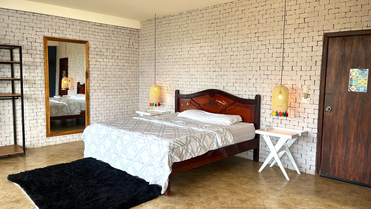 Herbergi á jarðhæð með hjónarúmi og tveimur kojum með 1,5 rúmum sem henta vel fyrir hópa eða fjölskyldur allt að 6 manns. Það er með loftkælingu, hagnýtt sérbaðherbergi, snjallsjónvarp með Netflix, fatarekka og fatahengi. Þægileg og vel loftræst. Ókeypis aðgangur að sundlaug, eldhúsi, grilli, görðum, hengirúmum og fleiru. Aðeins 7 mínútur frá ströndinni og miðbæ Montañita en fjarri hávaðanum. Kyrrð og rými til að deila.