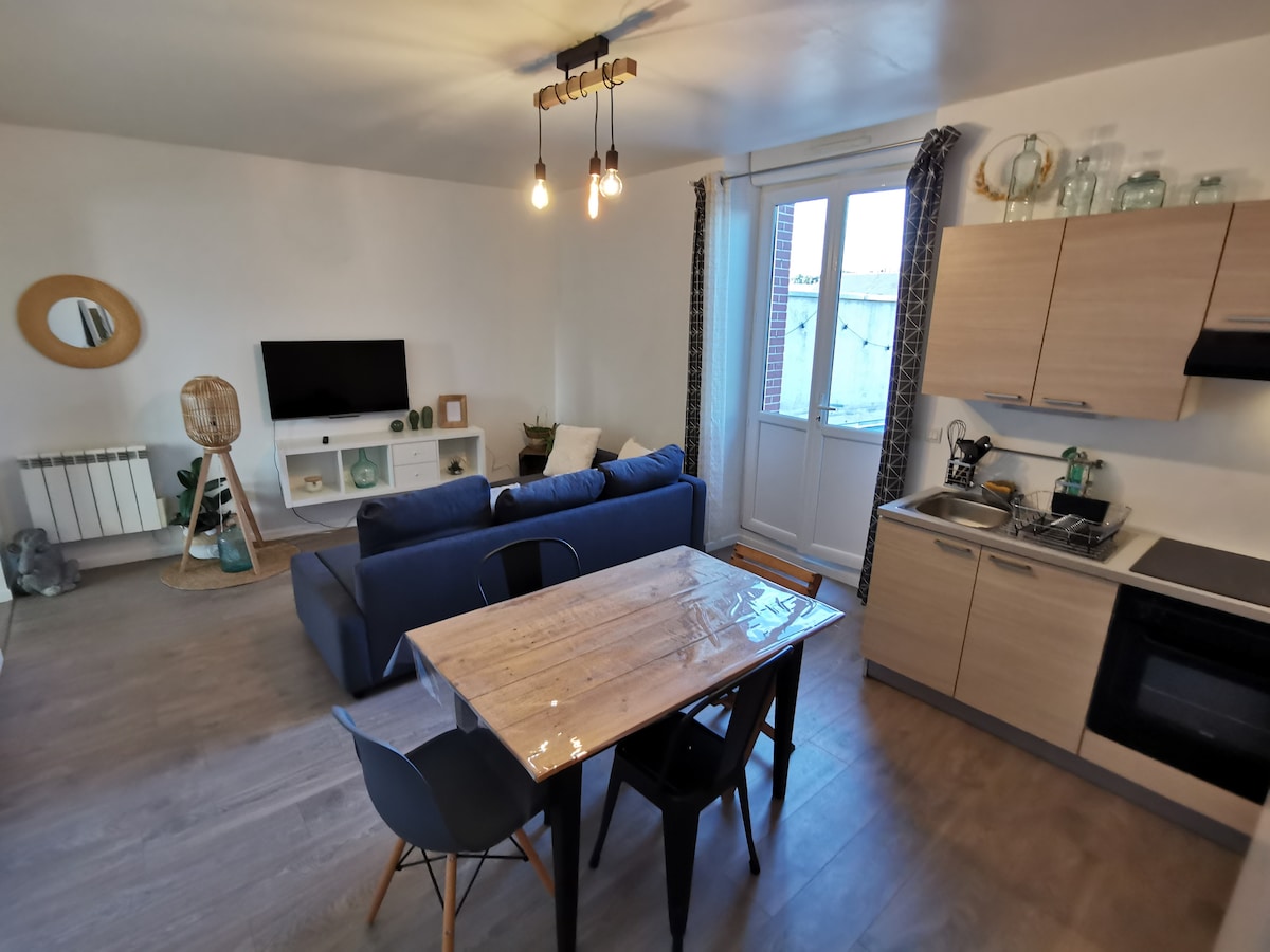Bienvenue à l'appartement "Côté jardin" de 42 m2. Vous y trouverez une déco style industriel avec cuisine ouverte. La chambre est dans un style "Jungle" avec un lit 160. Ce bel appartement se trouve à 5 mn à pied du centre d'Ancenis et des bords de Loire. Un parking gratuit est en face du petit immeuble. C'est l'endroit idéal pour poser ses valises pour un stage ou une formation. Tout est fourni ( linge de lit, linge de toilette ).