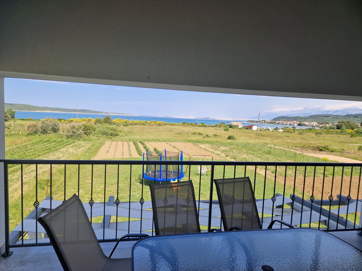 Njóttu tímans með fjölskyldunni á þessum nútímalega stað. Íbúðin er fullbúin fyrir áhyggjulausa dvöl. Það er með fallega verönd með útsýni yfir flóann, stóran garð og grill og það er aðeins í nokkurra mínútna fjarlægð frá sjónum. Slakaðu á á þessum friðsæla stað með fallegustu sólsetrunum.