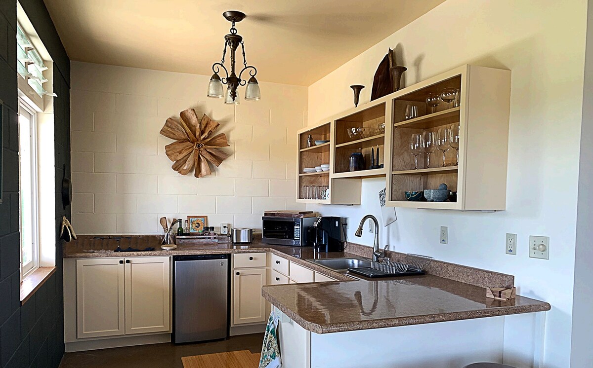 Njóttu friðsældar, fegurðar og friðsældar þess að búa á heimili þínu með mögnuðu útsýni yfir Kyrrahafið og hitabeltislandslagið í Lower Puna: þægileg og þægileg gistiaðstaða og opið rými. Komdu og upplifðu hráfegurð hraunþorps. Landinu hefur verið breytt. Fissure 8 og hertu hraunrennslið er í 10 mínútna göngufjarlægð frá heimili okkar. Þetta er förgun og sköpun; við og samfélag Puna í kring hefur verið umbreytt í þessa upplifun.