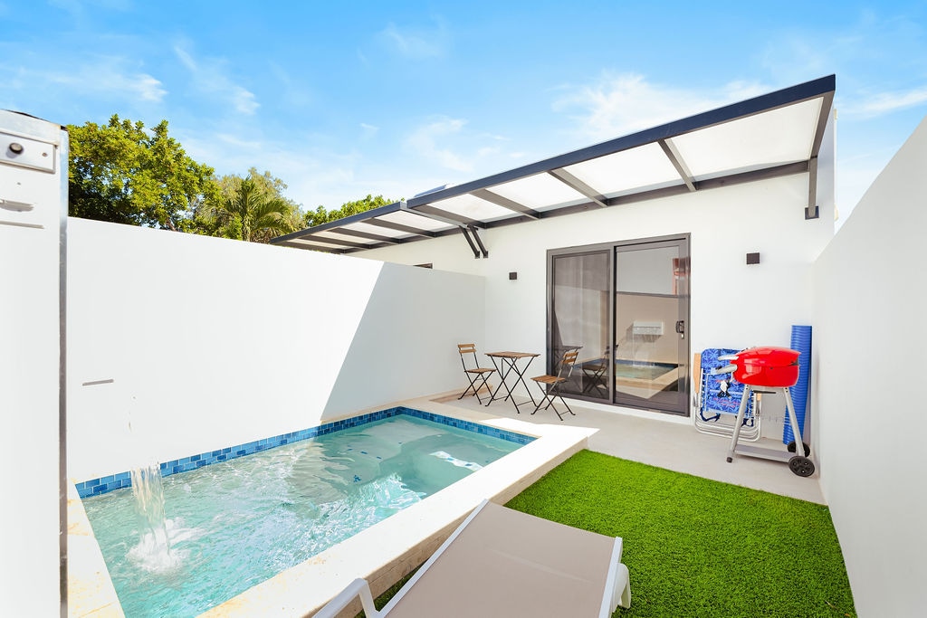 Allt sem þú vilt og fyrir þitt fullkomna hitabeltisfrí. ✔ Einkasundlaug / íbúð (sérinngangur) í öruggu villuhverfi ✔ Rúmgóð verönd með skyggðum setuaðstöðu utandyra/Palapa ✔ Ókeypis þráðlaust net og bílastæði ✔ King bed & pillows /new mattress for ultimate comfort for your vacation ✔ Karíbahaf með hreinum nútímalegum innréttingum ✔ Strandstólar og kælir ✔ Fullbúið eldhús (með uppþvottavél) ✔ Loftræsting og heitt vatn ✔ Falleg næturlýsing á verönd/sundlaugarsvæði fyrir fullkomna afslöppun.