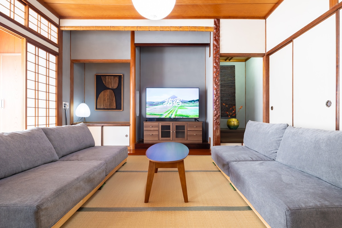 Masago Base Aðeins 15 mínútur frá Kagoshima Chuo-stöðinni!Leynileg bækistöð umkringd gróðri fyrir sérstaka dvöl. Masago Base er tveggja hæða einkarými sem rúmar allt að 7 manns.Þú munt skemmta þér vel í spennandi rými sem minnir á leynilega bækistöð. Frábært aðgengi!Fullkomin staðsetning fyrir skoðunarferðir. Það er á góðum stað, í aðeins 15 mínútna akstursfjarlægð frá Kagoshima Chuo-stöðinni en umkringt gróðri í rólegu umhverfi.Þetta er ekki aðeins miðstöð skoðunarferða í borginni sem og upphafspunktur ferðar til að njóta náttúrunnar eins og Yakushima og Sakurajima.Í nágrenninu eru einnig matvöruverslanir og kaffihús sem gera það þægilegt fyrir langtímagistingu. Rýmishönnun. Þú getur slakað á eins og heima hjá þér með nútímalegum innréttingum og rúmgóðri stofu og fundið hlýjuna í viðnum.Stórir gluggar hleypa inn miklu náttúrulegu sólarljósi sem gerir það að verkum að það er notalegt að vakna á morgnana. Óska þér sérstakrar ferðar í Masago Base.Við bíðum eftir bókuninni þinni!