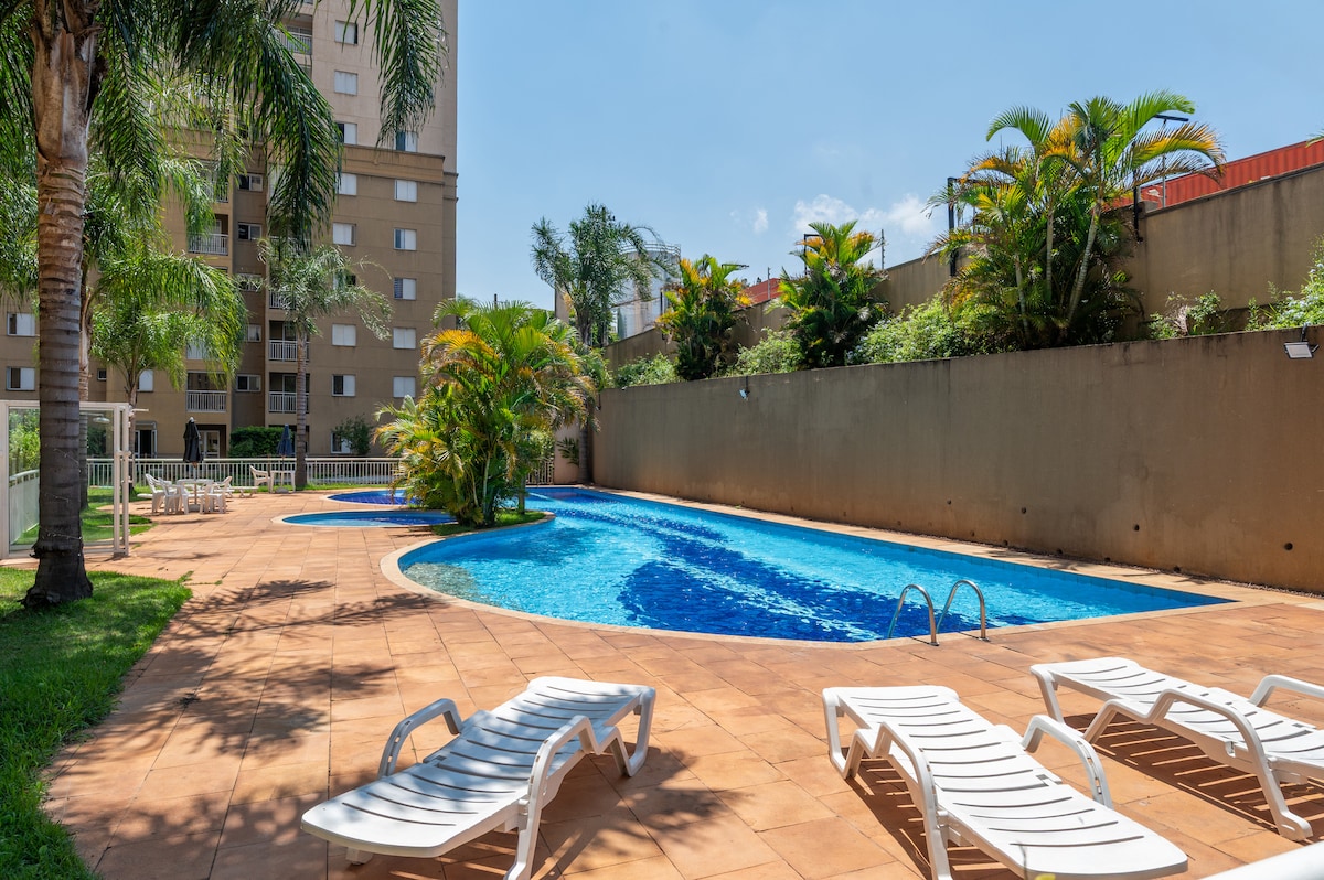 Frábær staðsetning í Osasco, SP. Í 50 metra fjarlægð frá Pinheiros og Tietê-ánni með greiðan aðgang að suður- og vestursvæðum São Paulo. 10 mín. frá Osasco stöðinni og 9 km frá Alphaville. Í eigninni er að finna 1 svefnherbergi og stóra stofu með 1 svefnsófa, bæði með loftviftu, snjallsjónvarpi, 1 baðherbergi og vel búnu eldhúsi. Stöð með þráðlausu neti 350 MB. Cond. with 24-hour concierge, swimming pool, gym and pet place. Litla gæludýrið þitt hefur verið samþykkt! Bókaðu á besta stað í borginni!