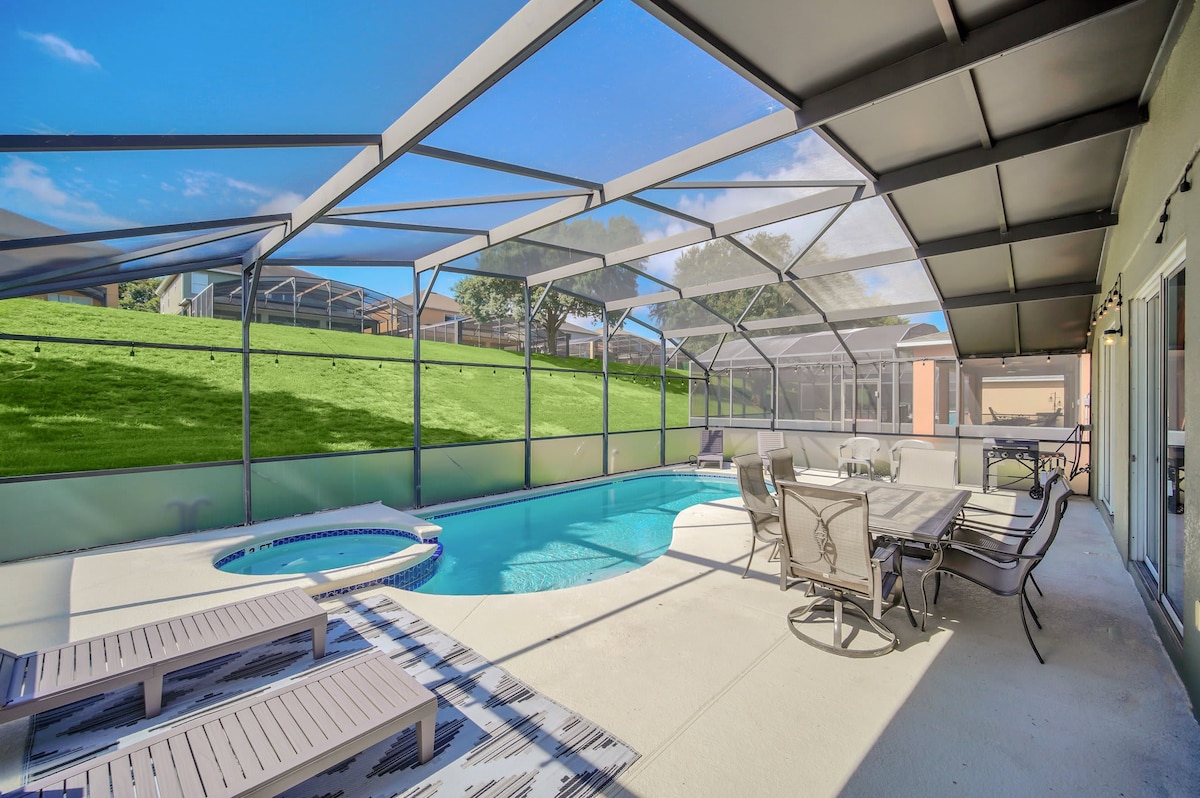 Hið fullkomna jafnvægi Á GLÆSILEGRI HÖNNUN, LÚXUSÞÆGINDUM og ENDALAUSRI AFÞREYINGU, fallega staðsett með stórkostlegu útsýni á hinum rúmlega 3,5 ferkílómetra Reunion Resort. Þú færð þína eigin einkasundlaug, heilsulind sem hellist niður, STAR Wars-kvikmyndaherbergi með pinball, klassískum spilakassaleikjum og karaókí, MARVEL barnaherbergi með rennibraut og tvöföldum kojum, nýjustu Xbox Series S, 2000 feta sundlaugarverönd, eldgryfju og meira að segja HARRY POTTER skáp sem er falinn undir stiganum og í nokkurra mínútna fjarlægð frá Disney.