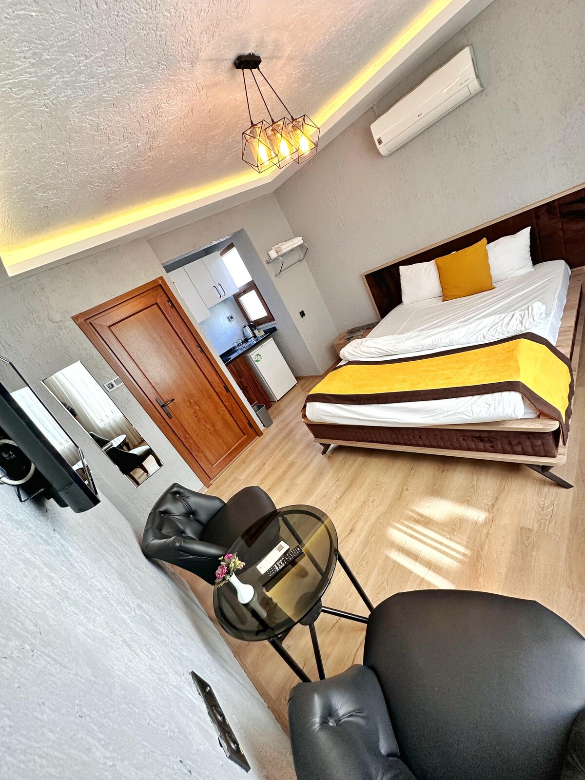 * Herbergið okkar með heitum potti er 35 m2 og þægilegt er að hreyfa sig fyrir 2 fullorðna með 400 lítra vatnsrými. *Fullkomið útsýni yfir Bursa-borg í boði. * Hún tilheyrir gestinum í herberginu og einhver annar má ekki nota hana. *Innritunartími er kl. 13:00 eða síðar *Útritunartími kl. 11:00 og fyrir Pera Pansiyon Bursa Centre