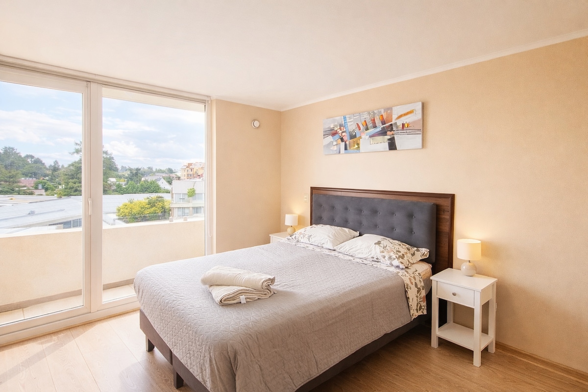 Hlýleg og nútímaleg íbúð, staðsett í hjarta besta hverfisins í Osorno, örugg, nokkrum skrefum frá miðbænum, með greiðan aðgang að matvöruverslunum, veitingastöðum og verslunum. Fullbúið og góð upphitun. Einkabílastæði. Gestir hafa aðgang að sameiginlegri sundlaug, líkamsrækt og leikjaherbergi. Í byggingunni er sólarhringsþjónusta sem tryggir rólega og umhyggjusama dvöl. Sjálfsinnritun! Og umhverfi með görðum og náttúrunni.