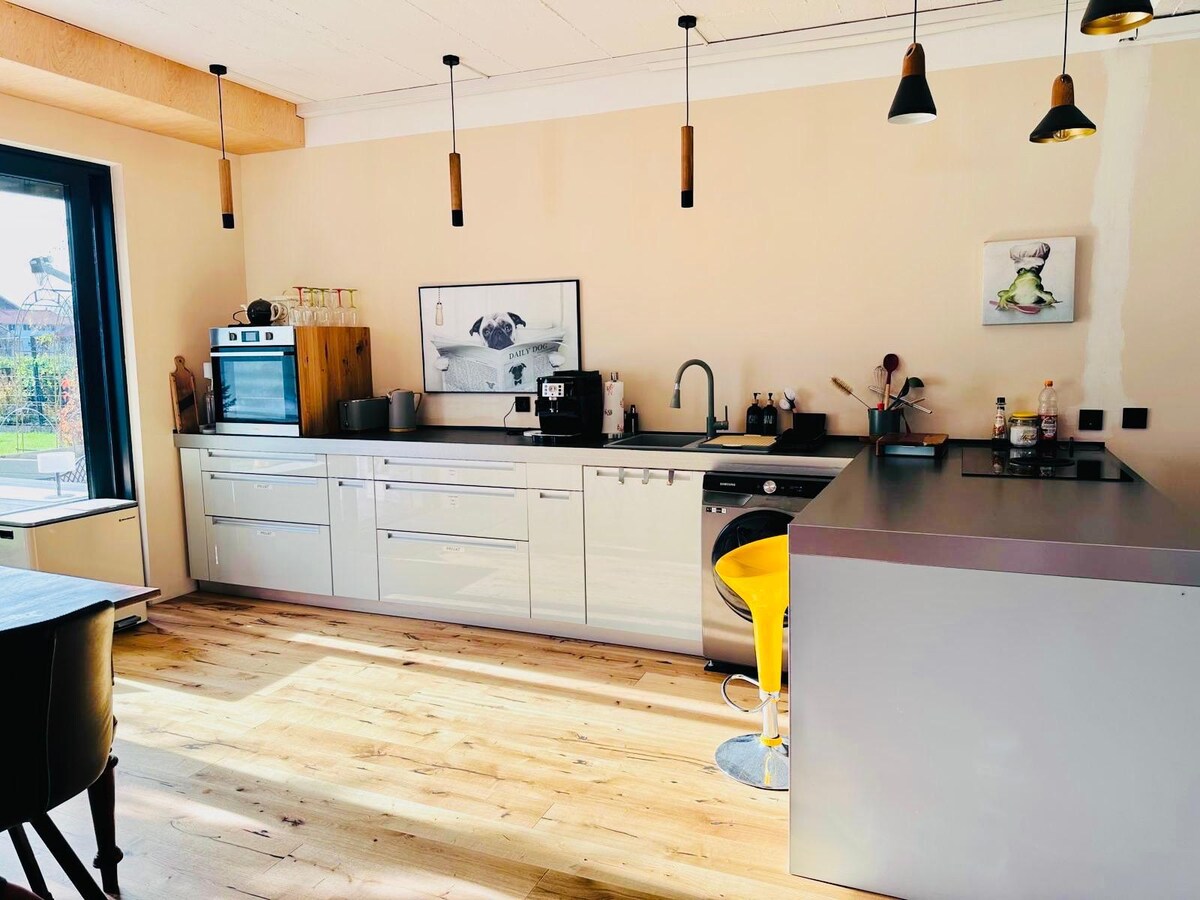 Undir þakbjálkum fyrrverandi sveitasetur býður loftíbúðin okkar þér í sérstaka stofu og svefnherbergi með gegnheilum eikargólfi og hitabeltisplöntum. Ljós, nútímalegt baðherbergi með stórum vellíðunar-/regnsturtu og glæsilegri hönnun. Hagnýta, nútímalega eldhúsið er með ofn með keramikhellu og hönnunarúddráttarhettu, uppþvottavél og stóran frístandandi ísskáp með frystihólfi.