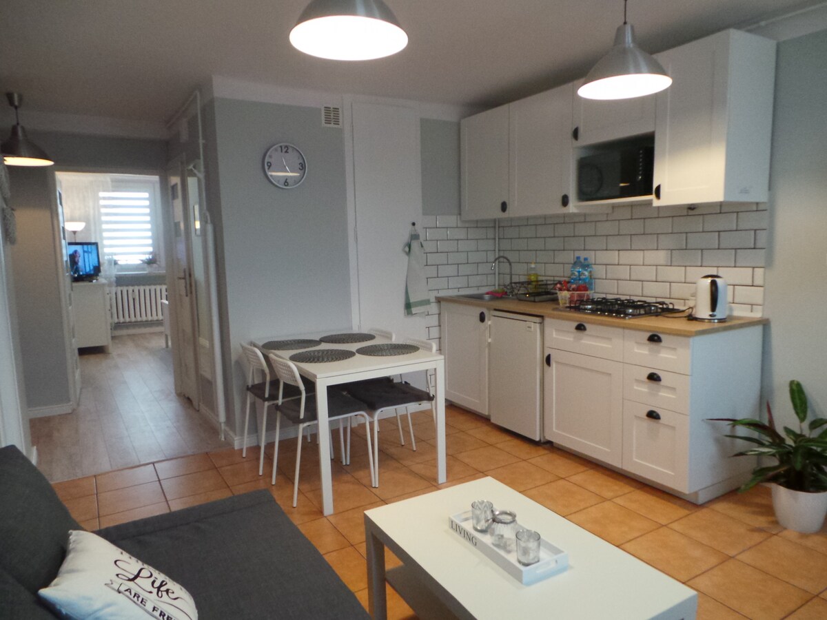 Leigðu út íbúð í Owiecim sem er í íbúðarbyggingu á 1. hæð. Pláss fyrir allt að 4. Það samanstendur af: 2 svefnherbergjum með tvíbreiðum rúmum, fullbúnu eldhúsi og baðherbergi með sturtu. Sjónvarp er í hverju svefnherbergi, þráðlaust net, rúmföt, handklæði, hárþurrka og ókeypis bílastæði fyrir framan fjölbýlishúsið.