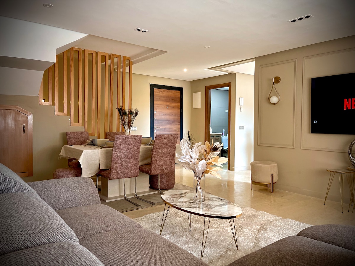 Slakaðu á í fáguðu og afslappandi umhverfi í Marrakech! Nútímaleg og þægileg íbúð sem hentar fullkomlega fyrir ógleymanlega dvöl. Dýfðu þér í sundlaugina á dvalarstaðnum og njóttu einnig aðgangs að vatnagarðinum með 2 sundlaugum, þar á meðal einni sem er aðeins fyrir konur og nóg af annarri afþreyingu fyrir börnin þín Þessi úthugsaða íbúð felur í sér . Breytanlegur hornsófi. Fullbúið eldhús Svíta með queen-rúmi Sjálfsaðgangur