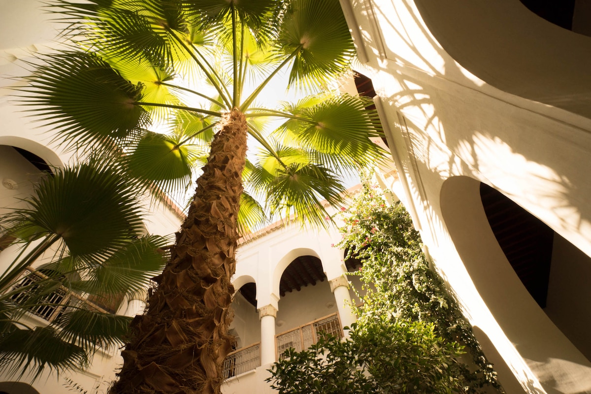 Við kynnum okkar ástsæla riad í hjarta Marakess. Ef þú ert par, fjölskylda eða vinahópur er Dar Nurah fullkomið afdrep fyrir fríið þitt í Marakess. Þar sem riad er aðeins leigt út í heild sinni verða engir aðrir gestir á staðnum. Heildaríbúðarplássið er um 180 fermetrar. Þar eru 2 vel innréttuð svefnherbergi með einkabaðherbergjum, stofa með svefnsófa og margar opnar stofur.