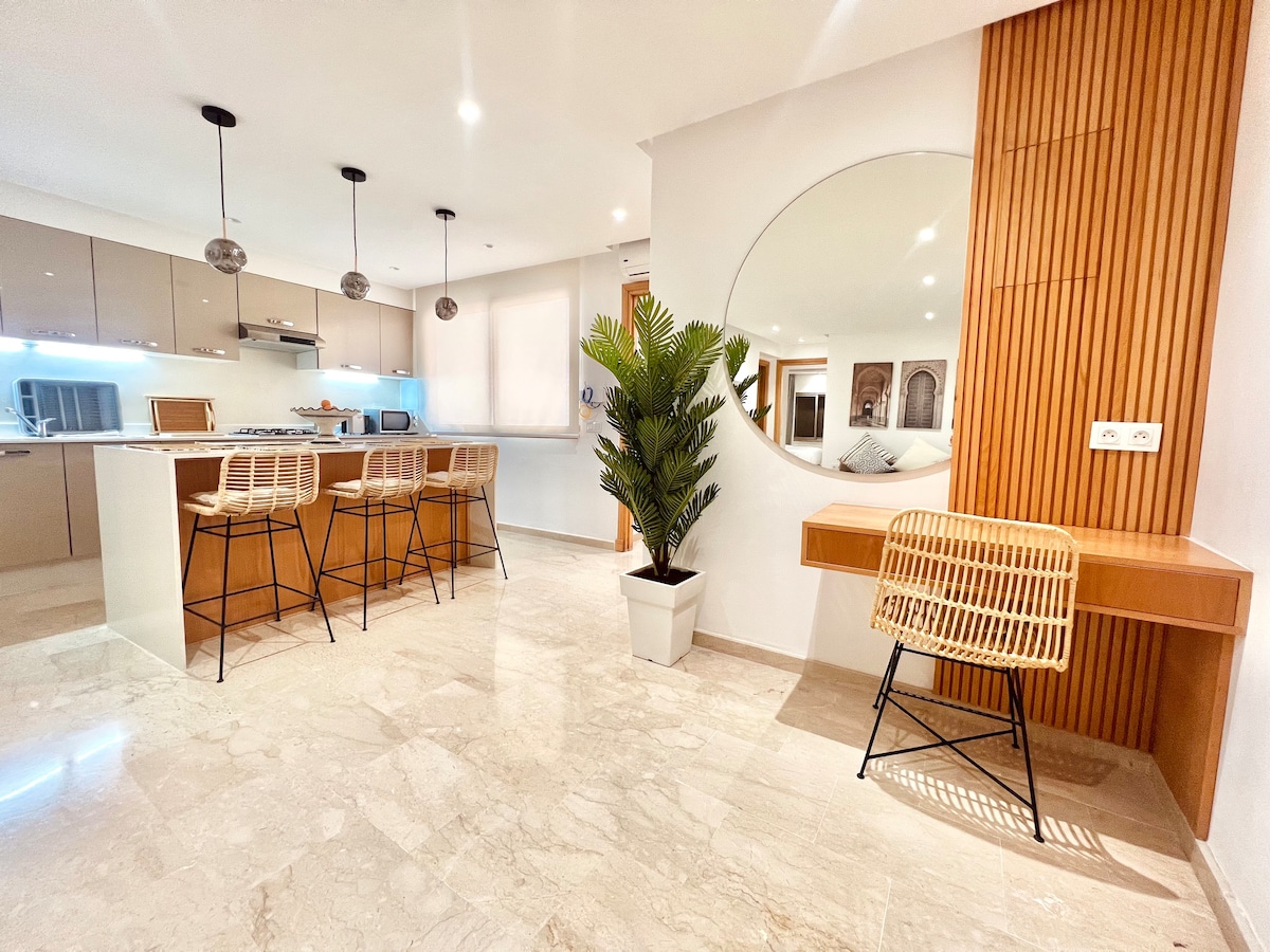 Gistu í hjarta Marrakech í 2 svefnherbergja, 2 baðherbergja íbúðinni okkar. Njóttu hágæða Simmons rúmfata, háhraða WiFi (ljósleiðari) og nútímalegra skreytinga með þjóðernislegu ívafi. Fullbúið fullbúið eldhús, glæsilegt baðker og ítölsk sturta. Stutt frá Jemaa el-Fna torginu, Plazza og Carré Eden. NB: Ógift marokkósk pör eru ekki leyfð.