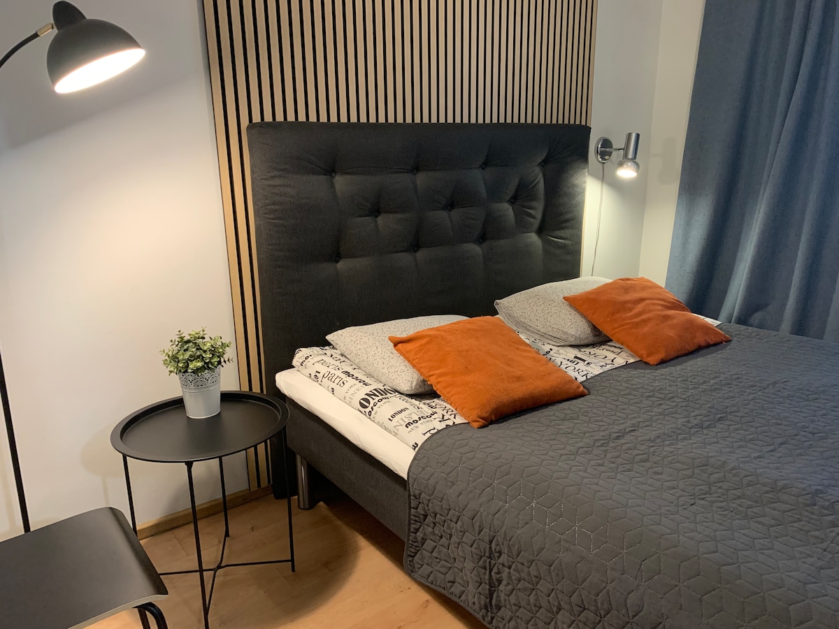Hér er einstök, loftkæld, fallega innréttuð tveggja herbergja íbúð á efstu hæð með gufubaði, á frábærri staðsetningu nálægt miðbæ Oulu. HLEÐSLA RAFBÍLS 10 EUR á dag. Einstök þaksverönd sem er breiðari en íbúðin sjálf og snýr í suður er draumur sólunýtslunnar. Stórir gluggar og stór rennihurð út á svalir gefa þægilega tilfinningu fyrir plássi. Nútímaleg íbúð með loftkælingu með plássi fyrir 1–5 fullorðna í miðbæ Oulu. Öll þjónusta í göngufæri. Ókeypis bílastæði. Frábær útivist. HLEÐSLUSTÖÐ FYRIR RAFKNÚIN ÖKUTÆKI