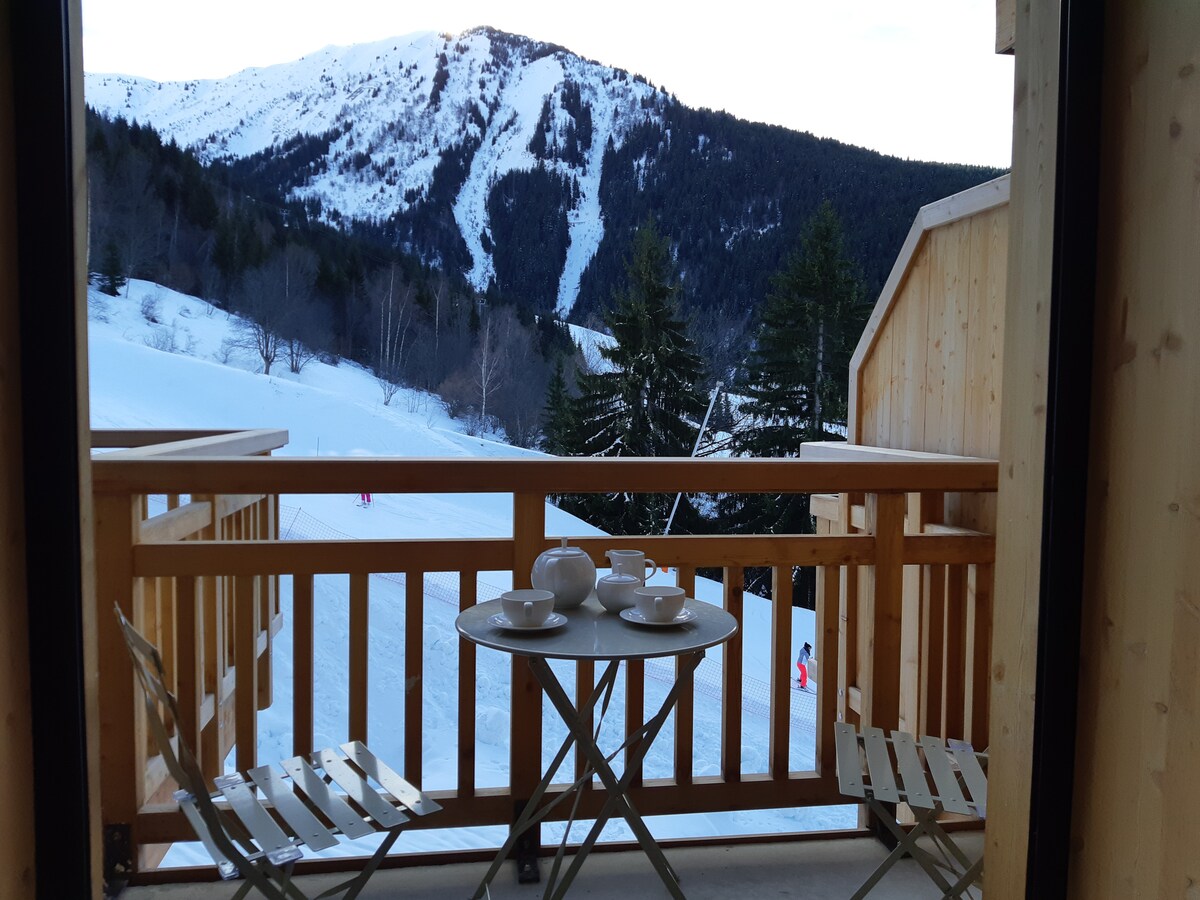 Ný íbúð við rætur brekknanna, miðstöð dvalarstaðarins. 63 m2 : 7 rúm (4 fullorðnir, 3 börn), 2 baðherbergi. Þegar þú kemur inn í íbúðina finnur þú: 1 stofa á 1 verönd með 70 m2 fjallasýn 1 svefnherbergi með hjónarúmi 160 og baðherbergi 1 svefnherbergi með hjónarúmi 160 1 fjallahorn með 3 einbreiðum rúmum 1 annað baðherbergi 2 salerni. 1 fullbúið eldhús 2 bílastæði og skíðaskápur Einkaþjónninn verður á staðnum á komudegi og brottfarardegi. Leiga frá laugardegi til laugardags