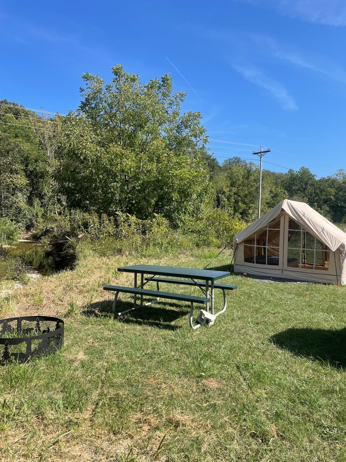 Lúxusútilegusvæði með aðgangi að Finley ánni. Frumstæð útilega eins og best verður á kosið. 5 mínútna göngufjarlægð frá ánni. Miðsvæðis með Branson 20 mílur í suður, og Bass Pro 20 mílum norðar. - ekkert rafmagn, með sólarljósum - rúm í fullri stærð - eldstæði og grill - útihús - nestisborð - Snjóhússkælir með fersku vatni - málmþak - aukatjöld $ 35 fyrir hvert tjald Gæludýr eru velkomin en mega EKKI vera á rúmfötum eða mottum. Ef hundahár er skilið eftir á rúmfötunum þarf að greiða $ 30.