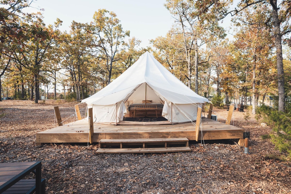 Gistu á The Embers Glamping and RV Resort í einu af notalegu tjöldunum okkar! Bjöllutjöldin okkar eru upphituð og loftkæld svo að þú getir tjaldað þægilega! Hvert þeirra er með king-rúmi, fúton með einum svefnsófa, kaffivél, litlum ísskáp, nestisborði og eldstæði. Baðhúsið okkar með sérbaðherbergissvítum er staðsett í nágrenninu. Allt lín er innifalið. Pakkaðu bara í töskurnar og búðu þig undir afslöppun! Sem gestur hér á The Embers hefur þú aðgang að öllum þægindum dvalarstaðarins! *LOKAÐ ER FYRIR SUNDLAUG Á VETRARÁRSTÍÐNU