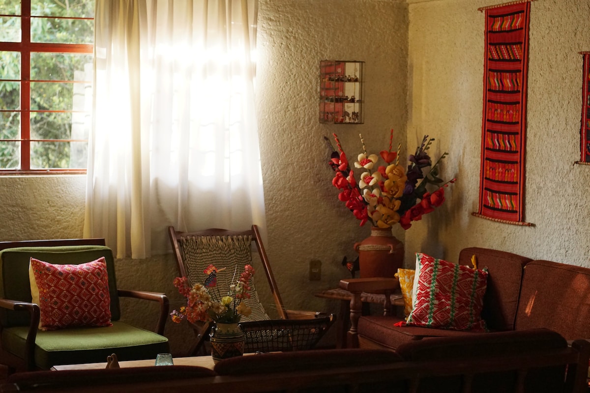 Faðmlag skógarins er einstakur staður í miðjum skóginum þar sem þú tengist náttúrunni. Það er með 4 svefnpláss….. Lokað svefnherbergi með king-size rúmi, queen futton og baðherbergi innandyra. One tapanco with 2 single beds and 2 “glamping” campaign houses with 2 individual inflatable mattresses each. Aðeins 25 mín. frá Pachuca og 10 eða 20 mín. frá töfrandi þorpunum ( Real del Monte, Mineral del Chico og Huasca) finnur þú þennan töfrandi stað.