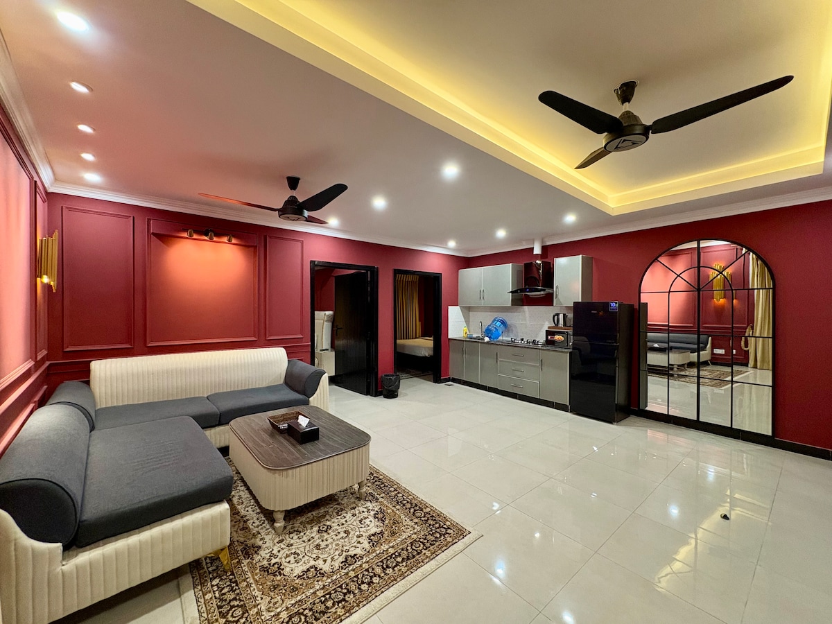 Our 1 BR condo in DHA Phase 5 is where urban chic meets celestial cool. Think: a glowing moon wall for those late-night selfies and a bold dollar-stacked art piece that screams "main character energy" Wake up to park views from your private balcony swing, binge your faves on the 50" 4K Smart TV, or cook up something aesthetic in the fully loaded designer kitchen. The interiors? Abstract, stylish, and made for the feed. Plus, you're right next to Lahore's hottest dining spots.