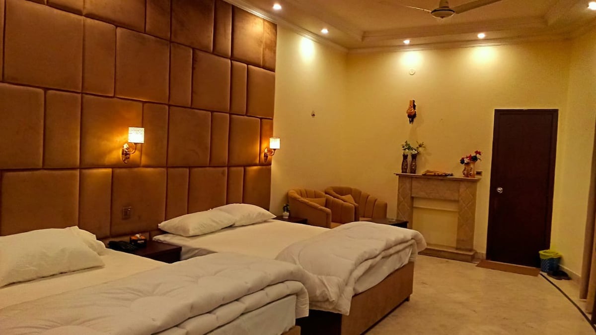 Verið velkomin í lúxussvítu í G7 Markaz, Islamabad. Glæsilega hönnuð svítan okkar býður upp á nútímalegar innréttingar, rúmgott skipulag og aðliggjandi einkabaðherbergi með heitu og köldu vatni. Njóttu flatskjás fyrir afþreyingu og ókeypis háhraða þráðlaust net. Byrjaðu daginn á ljúffengum morgunverði fyrir tvo sem fylgir með gistingunni. Móttaka allan sólarhringinn. Hótelið okkar er þægilega staðsett nálægt Centaurus-verslunarmiðstöðinni og Faisal-moskunni og tryggir ógleymanlega upplifun.