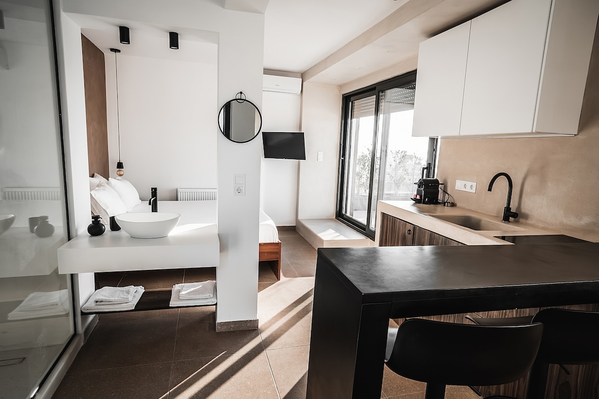 Á 7. hæð er þessi ótrúlega 33 m2 svíta nýuppgerð með frábærum efnum og minimalískri/hönnun frá Kýkladum. Ströndin er í um 5 mínútna göngufæri. Sjávarútsýnið er töfrandi, einkum við sólsetur. Þú getur einnig séð Akrópólis frá stóra svölunum! Slakaðu bara á og njóttu heita pottarins í algjörri næði. Þetta er einstök og íburðarmikil upplifun sem þú getur fengið! *Lyftan fer upp á 6. hæð*