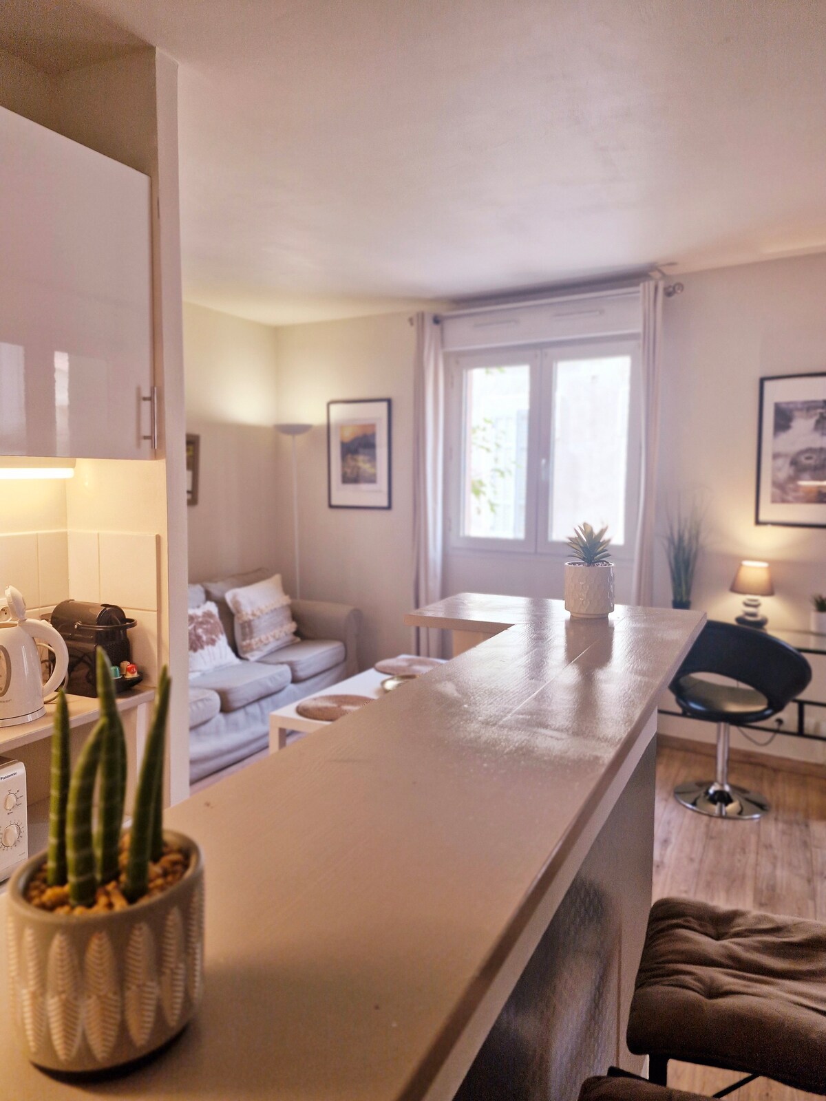 Þér mun líða eins og heima hjá þér í byggingu í Haussmann-stíl við Quai de la Joliette, á MÓTI Terrasses DU-HÖFNINNI. Bryggjur, Halles de la Major, markaðirnir eru í aðeins 200 metra fjarlægð. Þú verður í 5 mínútna göngufjarlægð FRÁ MuCEM, í 8 mínútna göngufjarlægð frá Vieux-Port og sjávarsíðunni og bátsferð til Calanques á sumrin... Einfaldlega ótrúleg staðsetning fyrir (frekar líflega) upplifun í Marseille, eins vinsæl og hún er skemmtileg, í sögulega Panier-hverfinu, heillandi milliland.