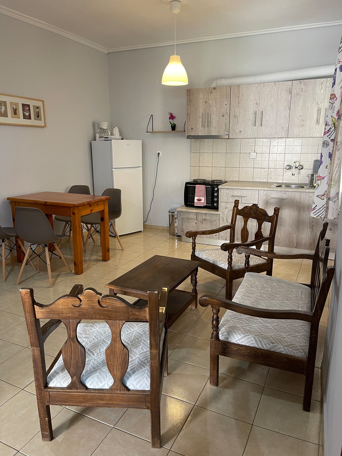 Slakaðu á í þessum rólega gististað. Íbúðin er á jarðhæð . Það samanstendur af svefnherbergi með 1 hjónarúmi, 1 koju og skáp , baðherbergi með sturtu, opnu svæði með fullbúnu eldhúsi (stórum ísskáp, eldhúsi, eldavél, þvottavél, uppþvottavél , franskri kaffivél, brauðrist, diskum og glösum og hnífapörum) , borðstofuborði með 6 stólum og stofu með sjónvarpi. Í skápnum er straujárn, strauborð, hárþurrka. 4 km frá höfninni, 1 km frá ströndinni