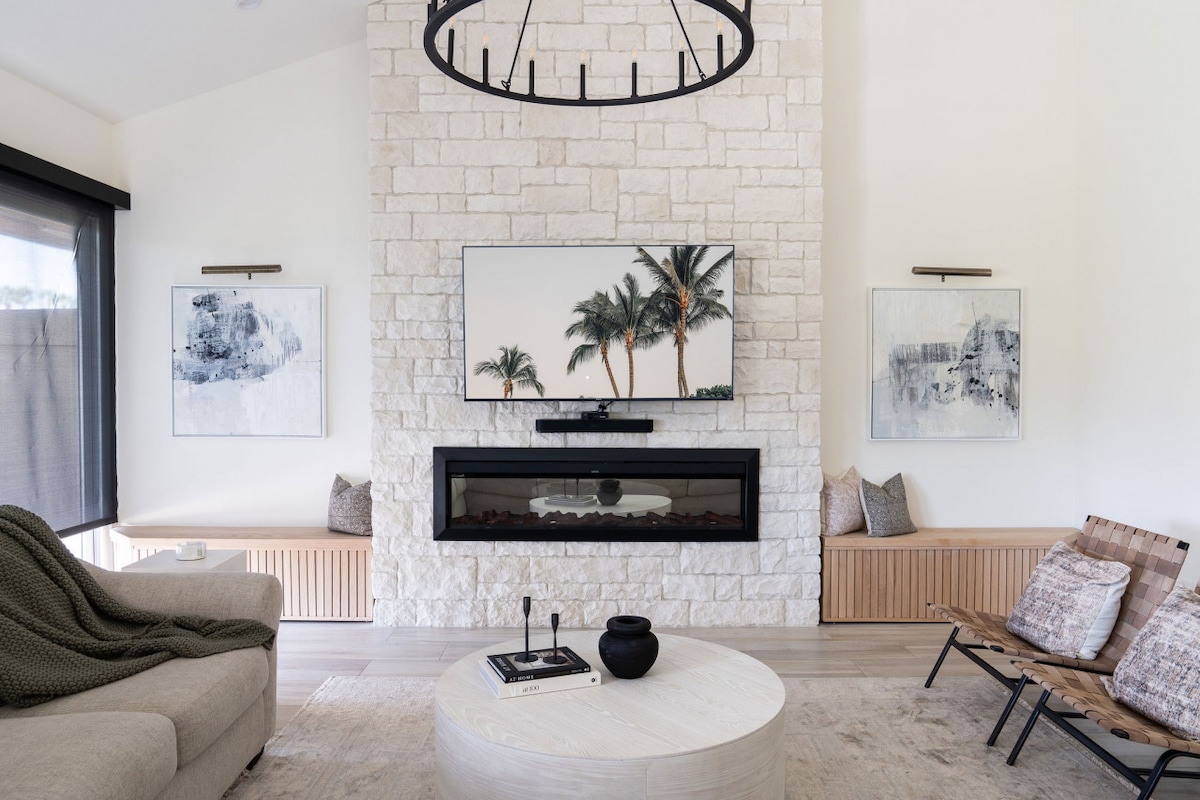 Glænýtt, bjart og nútímalegt heimili með 3 svefnherbergjum, sundlaug og heilsulind er staðsett efst í La Quinta Cove með 270 gráðu fjallaútsýni Aðalatriði: + Hugmynd að opnu rými í stóru herbergi +Kokkaeldhús +Notaleg stofa með arni +Hátt til lofts +3 setusvæði utandyra +Háhraða ÞRÁÐLAUST NET +3 sjónvörp með kapalsjónvarpi, HBO Max, Showtime Anytime, Netflix + Hulu +grill +2 Bílskúr + Stórkostlegar göngu- og hjólaleiðir aðeins einu húsaröð í burtu! +Vel metnar golf- og tennisvellir í nágrenninu +Gamli bær La Quinta
