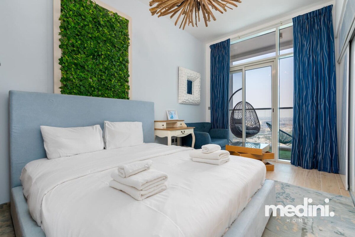 Uppgötvaðu glæsileika tindsins í glæsilegu íbúðinni okkar á 56. hæð í Marina Gate-turninum með frábæru útsýni yfir smábátahöfnina í Dúbaí og sjóinn. Staðsett í hjarta Dubai Marina, þú ert steinsnar frá JBR-ströndinni og úrval úrvals veitingastaða, verslana og afþreyingarmöguleika. Slakaðu á í fallegu stofunni, eldaðu í fullbúnu eldhúsinu og njóttu friðsæls næturútsýnis á einkasvölunum. Og ekki missa af frábærri sundlaug! Bókaðu þér gistingu núna!