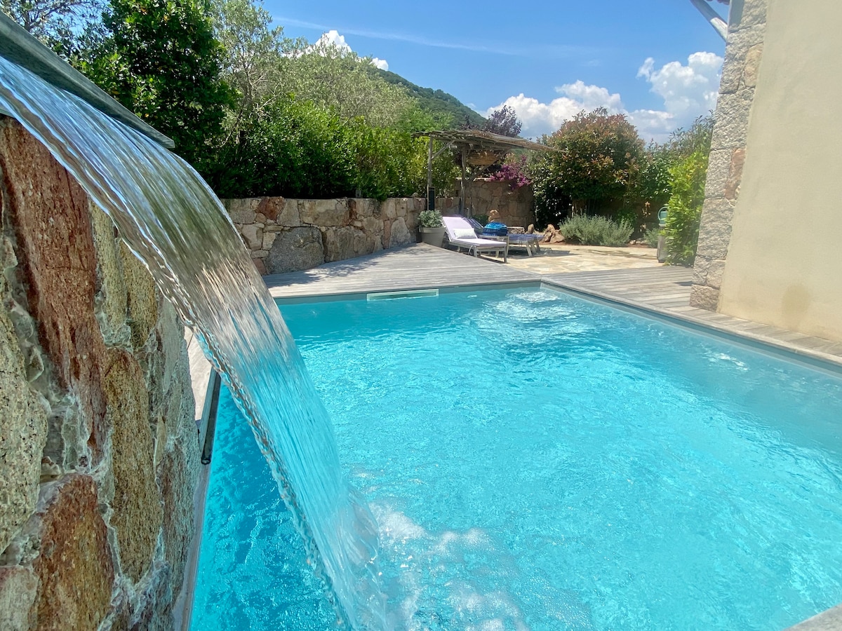 VÍÐÁTTUMIKIL VILLA MEÐ MÖGNUÐU SJÁVARÚTSÝNI OG PALOMBAGGIA-STRÖND. Villa okkar, sem er fullbúin, er staðsett í hæðum hótelsins Relais & Châteaux Les Bergeries de Palombaggia og býður upp á 4 svefnherbergi, stóra stofu með verönd sem býður upp á sólböð og nuddpott og öll þægindin sem þú þarft til að gera fríið þitt að forréttindum í miðju korsíska kjarrlandinu. Hægt er að komast að ströndinni , 700 metrum frá villunni okkar, á einkastíg fótgangandi.