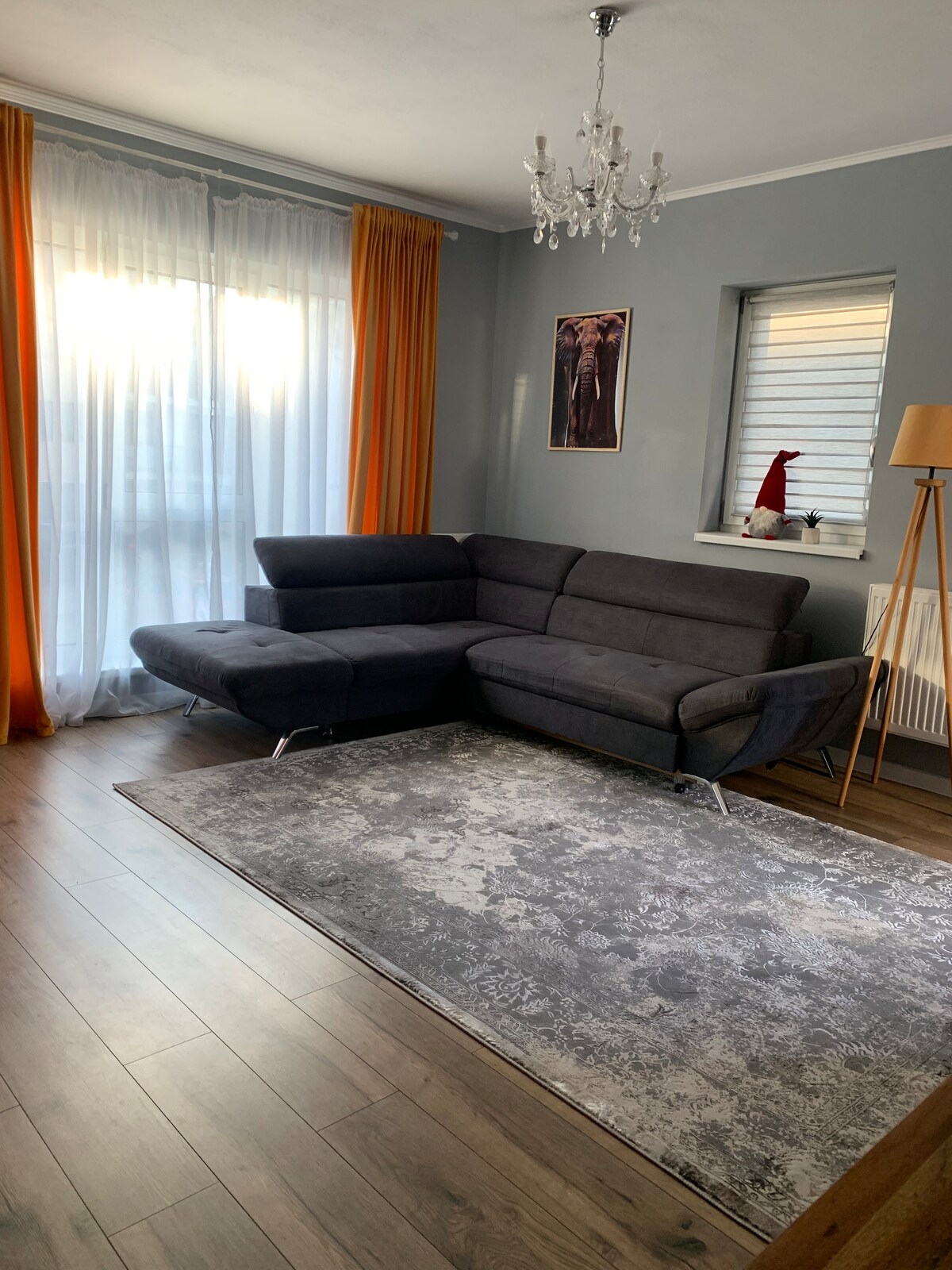 Þetta glæsilega gistirými er fullkomið fyrir gistingu fyrir 1-4 manns; það er með 2 hjónarúmum. Íbúðin er mjög hrein,rúmgóð, þægileg,nútímaleg,stílhrein og vel með farin,í nýrri blokk,á 1. hæð,með svölum, fullbúnum nýjum búnaði,þar á meðal loftræstingu, á rólegu svæði í Sibiu,þaðan sem þú getur náð á 7 mínútum í miðborginni. Við erum með einkabílastæði,öruggt, á lóðinni og næstum almenningssamgöngur beint í miðborgina. Þér mun líða eins og heima hjá þér!