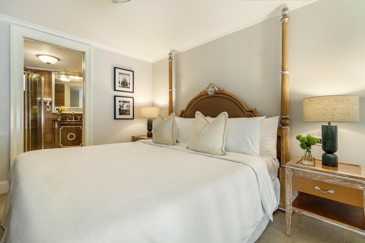 Bienvenido a Hotel Bardot Boutique, donde el lujo clásico y el diseño sofisticado se encuentran en perfecta armonía en el corazón del Casco Antiguo. Nuestra Habitación Deluxe de 30 m² ha sido diseñada para ofrecer una experiencia íntima y elegante para dos personas. Destaca su imponente cama con dosel, detalles dorados y una atmósfera cálida que invita al descanso absoluto. La habitación incorpora una hermosa bañera integrada, creando un ambiente romántico que eleva cada instante de estancia.