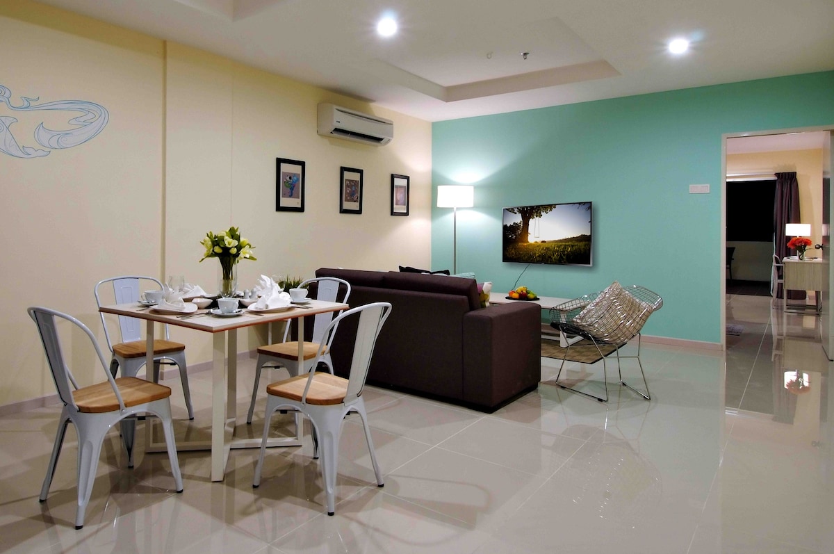 Það er staðsett á manngerðri eyju gegnt Pangkor-eyju. Nútímaleg hönnun á einu svefnherbergi, einni stofu, einu baðherbergi, svölum og eldhúsi. Íbúð sem snýr að sjó og fjalli. Aðeins 10 mínútur með ferju til Pangkor-eyju, 10 mínútna akstur til Teluk Batik, 15 mínútna akstur í miðbæinn. Hentar vel fyrir fjölskyldu og vini sem eyða fríi í þessu fallega afdrepi.