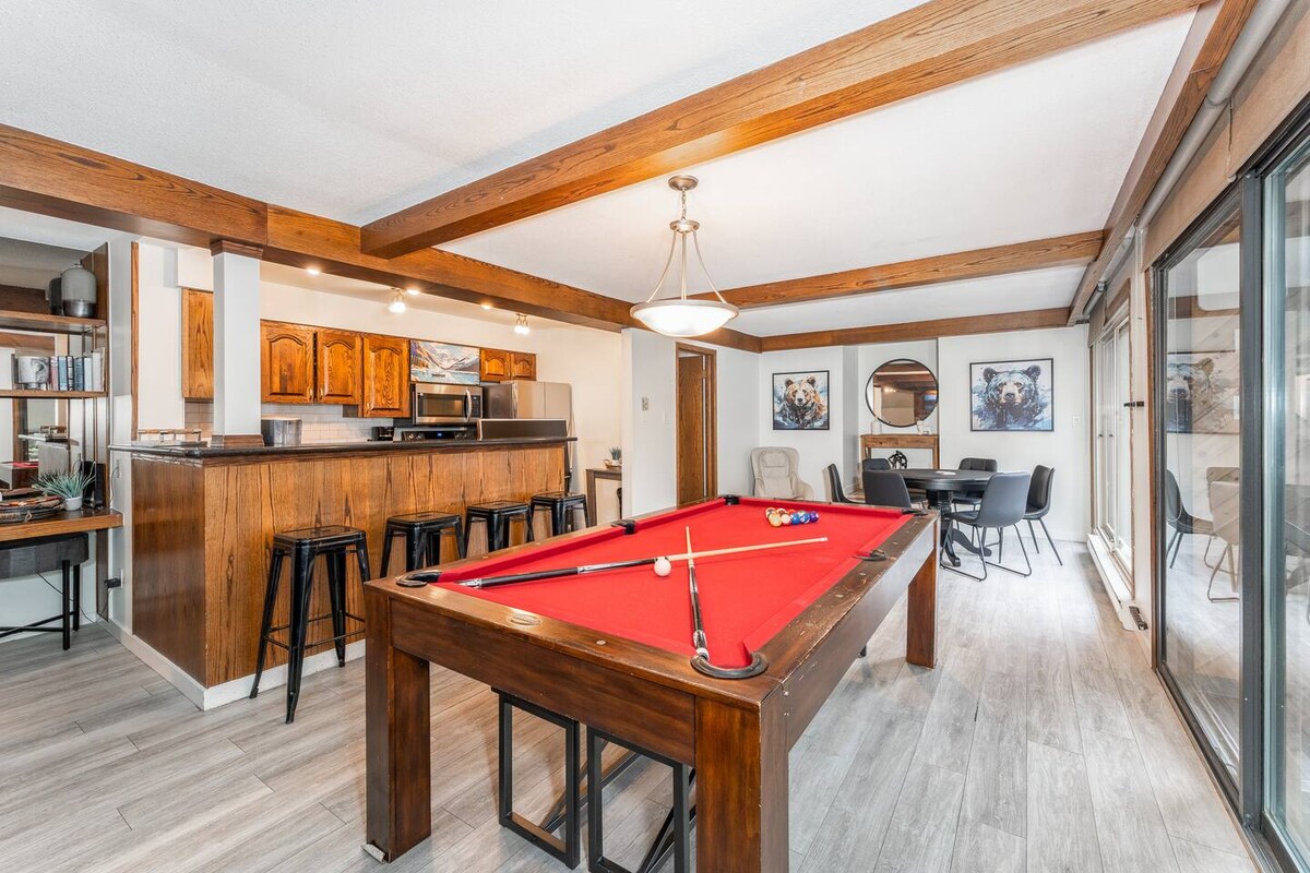 Staðsett í Upper Village í aðeins nokkurra skrefa fjarlægð frá Silver Platter, þú munt ekki finna betri staðsetningu í Panorama. Uppgert nútímalega bæjarhús okkar í efra þorpi er fullkomið fyrir hópa og fjölskyldur. Sannkallað skíðaheimili sem er staðsett í aðeins nokkurra mínútna fjarlægð frá sundlaugunum og miðbænum. Þessi þriggja hæða eining býður upp á loftræstingu í svefnherbergi, fullbúið eldhús, gasarinn, þvottahús og bónussjónvarp og geymslusvæði á neðri hæðinni. Íbúðin er einnig með stórum þilfari á jarðhæð og grilli sem er sjaldgæft í Panorama.