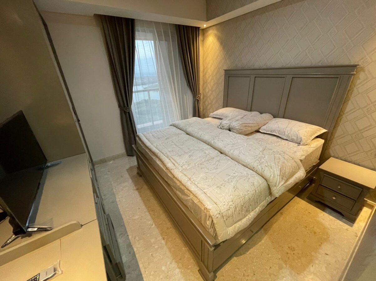 Glænýr og einstakur staður þar sem þú getur slakað á líkamlega og andlega. Það er með 1 svefnherbergi og 1 baðherbergi. Þar er hægt að taka á móti 4 manns. Það er með 1 rúm í king-stærð og samanbrjótanlegan svefnsófa fyrir 1-2 manns. Þú getur notið stórkostlegs útsýnisins við sjávarsíðuna. Mjög hreinlegt og snyrtilegt. Við munum skipta á rúmfötum og handklæðum og sótthreinsa þau einnig, þar á meðal gólfin, fyrir innritun. Nálægt PIK Ave-verslunarmiðstöðinni er nú vinsæll áfangastaður í Jakarta.