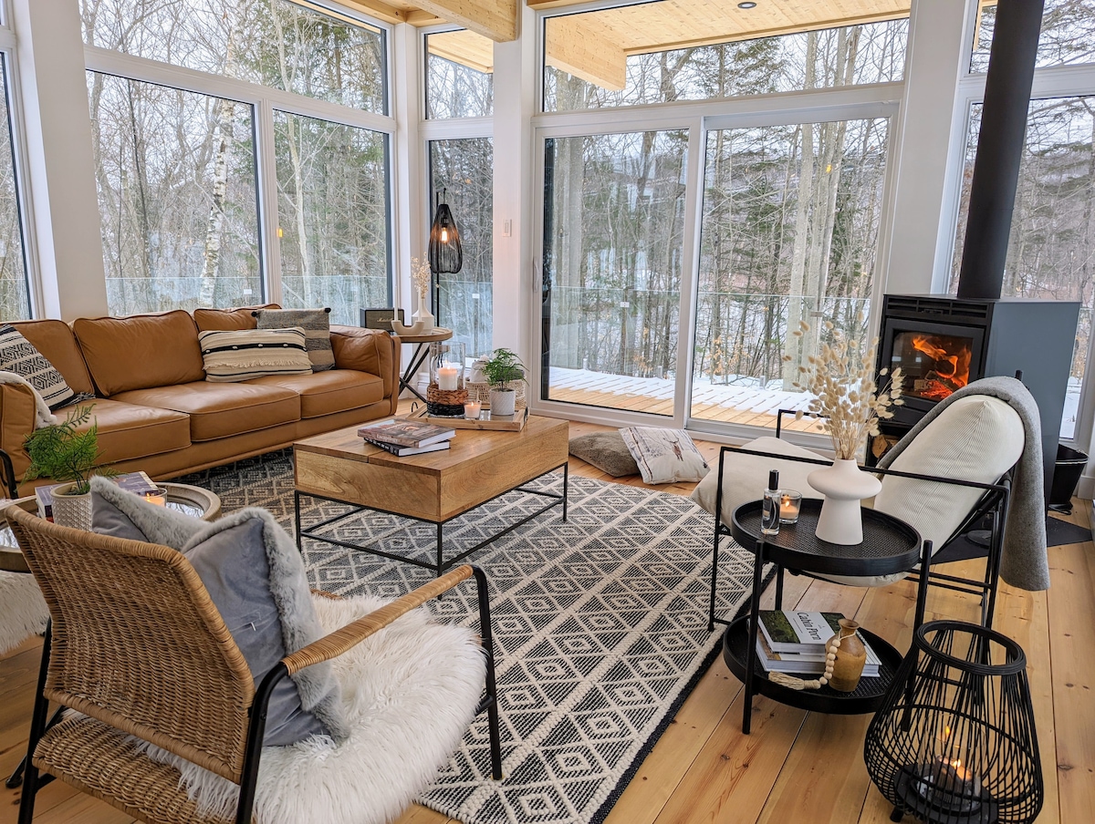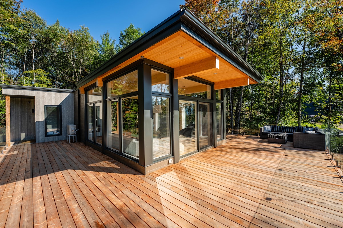 Contact us for our ongoing Promotion! Secluded Architect Glass Cabin perched for breathtaking Mont-Tremblant mountains views! Klint Tremblant (Cliff in Danish) is the unique design so you can retreat to comfort and luxury. It is a majestically glazed architectural space combining natural simplicity & contemporary luxury, 10 min from village Mont-Tremblant & Panoramic terrace & Private Hot tub In Laurentian. Designed by Canadian famous Designer in shared domain of 1200 Acres!