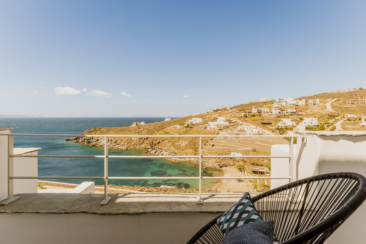 Húsið er staðsett á Agios Romanos 'ströndinni. Hægt er að ganga að ströndinni. Það er krár, lítið kaffihús og strandbar. Sófar og king-size rúmið eru innbyggð. The framúrskarandi eiginleiki hússins er einstakt útsýni, sem þú getur notið frá öllum herbergjum og svölum. Eftir að dvöl lýkur er húsið hreinsað með gufuhreinsitæki og hreinsiefnum sem innihalda klór. Meðan á dvöl þinni stendur, og ef þú vilt, er húsinu þrifið á þriggja daga fresti, án endurgjalds.
